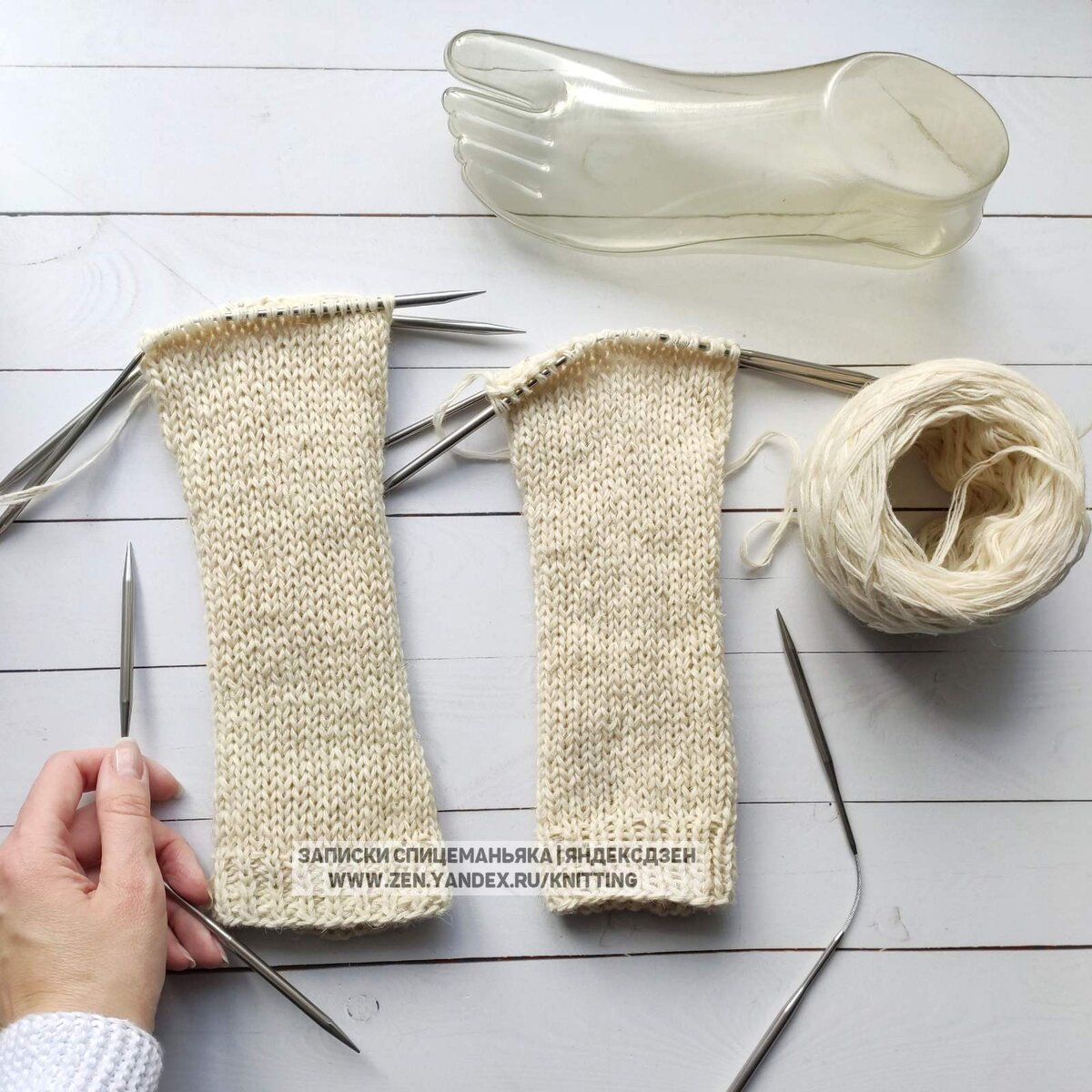 Носочный профессор снова готов вещать с кафедры про ещё одну идею, даже две! Они буквально логичные, как раньше не пришло в голову - незнамо. В области дизайна идеи, то есть узора для простейших носков. Это про носки-трубы. Сначала приведу ссылки как их вязать хоть 2 спицами, хоть вкруговую, и какие вообще бывают варианты вязания + узоры, чтобы на сравнении как бы для себя увидеть - ваше или нет :) А этот способ - делать резинку в зоне пятки и до середины стопы. Это перед так выглядит в обоих вариантах: Или от манжеты резинку делать и так всю дорогу сзади, но до середины стопы (где свод). В этом случае получается еще лучше результат в плане полного облегания сверху и до пятки (справа): Облегает замечательно, но без перебора, и у кого чувствительные в мысе стопы - не будут ощущать неудобство резинки, ибо там гладь. А в пятке даже мне, принцессе на горошине, не было сильно понятно, что она не вылепленная по канонам, скажем так, прям дискомфорта не было :) Напомню: Главное, мысок делать