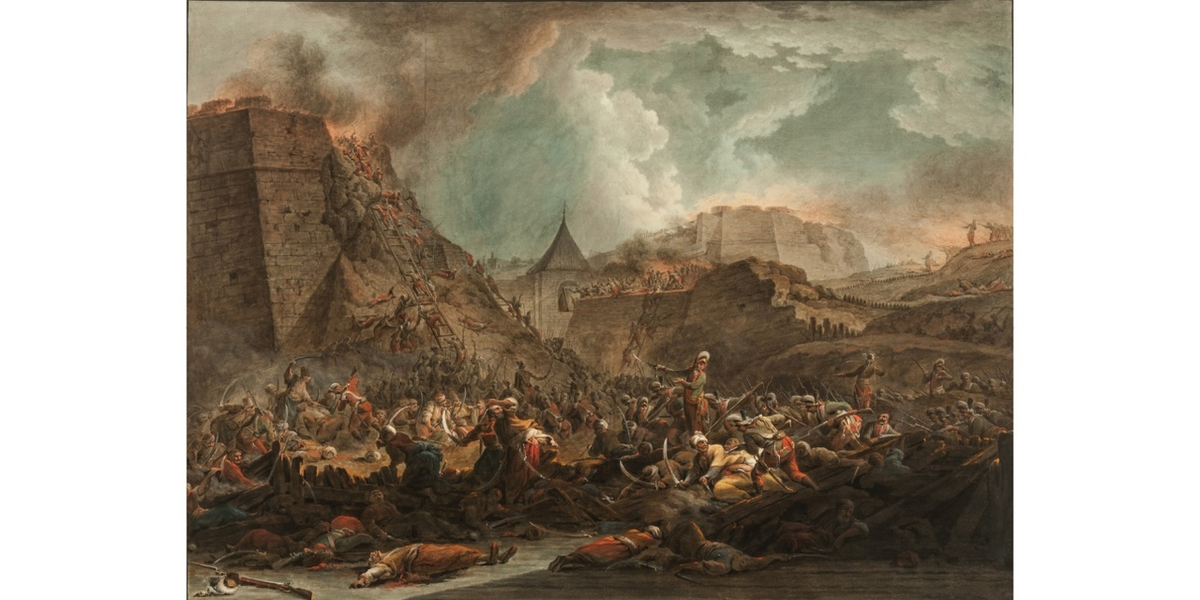 Штурм турецкой крепости Измаил в ходе второй русско-турецкой войны (1787–1791) был предпринят по приказу главнокомандующего южной армией генерал-фельдмаршала Григория Потемкина. После многократных неудавшихся попыток покорить считавшуюся неприступной крепость 22 декабря 1790 русские войска под командованием генерал-аншефа Александра Суворова после осады штурмом наконец взяли турецкую твердыню. Взятие Измаила, расположенного в стратегически важной точке пересечения путей на берегу Дуная, имело большое политическое значение. Оно повлияло на дальнейший ход войны и на заключение в 1792 году Ясского мирного договора между Россией и Турцией. На гравюре показан начальный момент штурма, когда в три часа ночи взвилась первая сигнальная ракета, по которой войска оставили лагерь и, перестроившись в колонны, выступили к назначенным по дистанции местам. В половине шестого утра колонны двинулись на приступ.