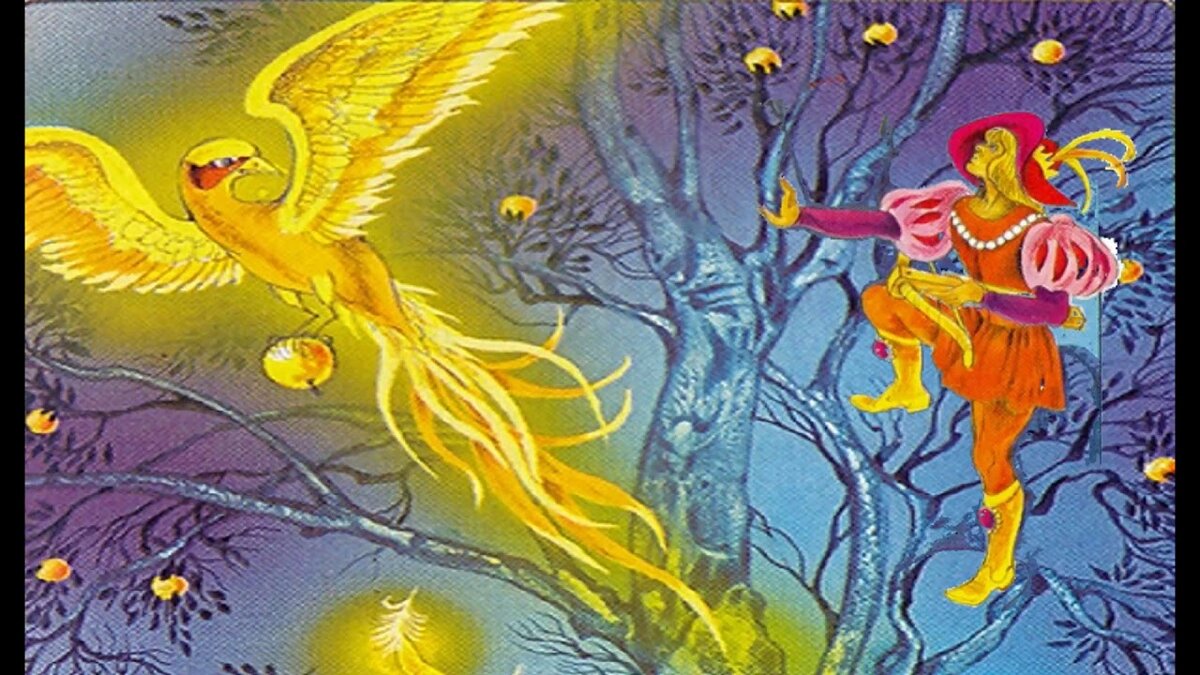 Вот юноша и улегся под деревом, и глаз не сомкнул, и сну не поддался. Как ударила полночь, так зашумело что-то в воздухе, и он увидел при лун- ном свете слетевшую на дерево птицу, у которой перья блестели как золото.