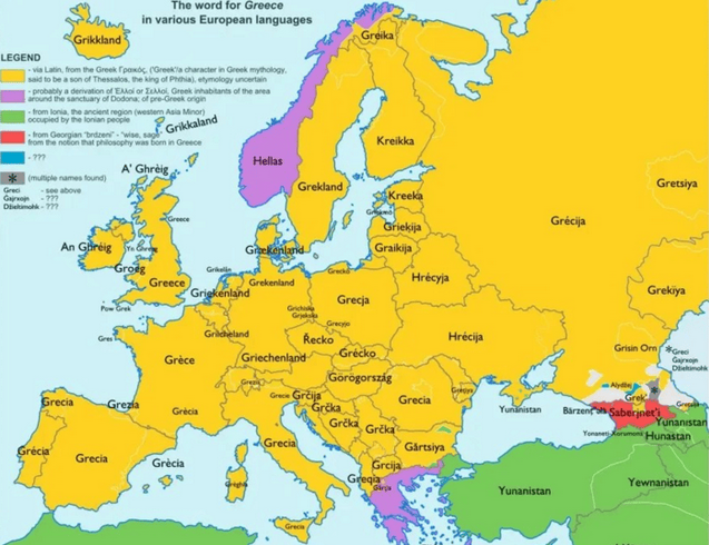 А впоследствии "грек" и "Греция" были объединены. Но, поскольку это искусственные, не связанные друг с другом понятия, местному населению нынешней Греции непонятно, почему весь мир их называет не так, как они сами себя именуют.