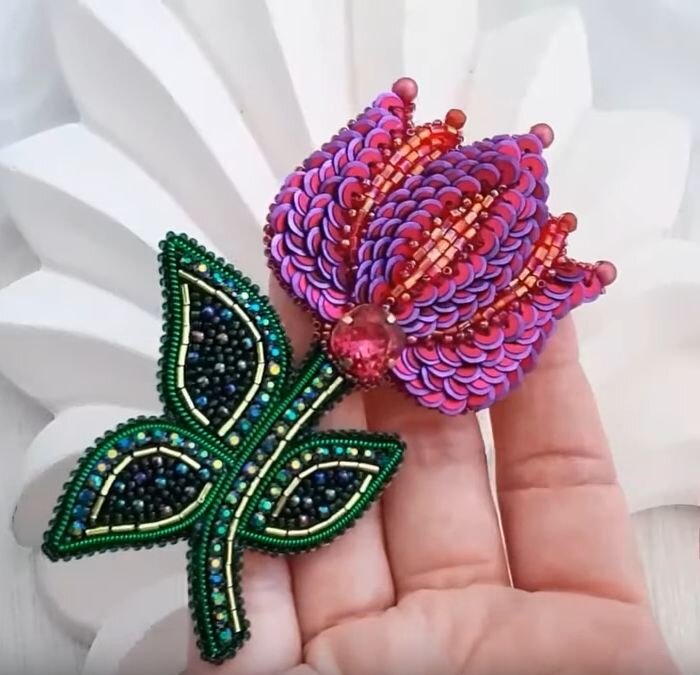 Источник: Скриншот из видео Такие аксессуары изготавливаются в технике вышивки по основе, чаще всего это фетр, очень бюджетный и доступный материл, неприхотливый в обработке. Так что смастерить симпатичное украшение такого рода сможет всякий, кто задастся целью. Нужно просто посмотреть фотографии и картинки растения, нарисовать эскиз в натуральную величину, предполагая, какие именно материалы вы будете использовать в работе. Ну а затем выполнить непосредственно сам процесс. Да, и в качестве стартового такой проект тоже работает, если вы новичок в этом виде рукоделия. Прос