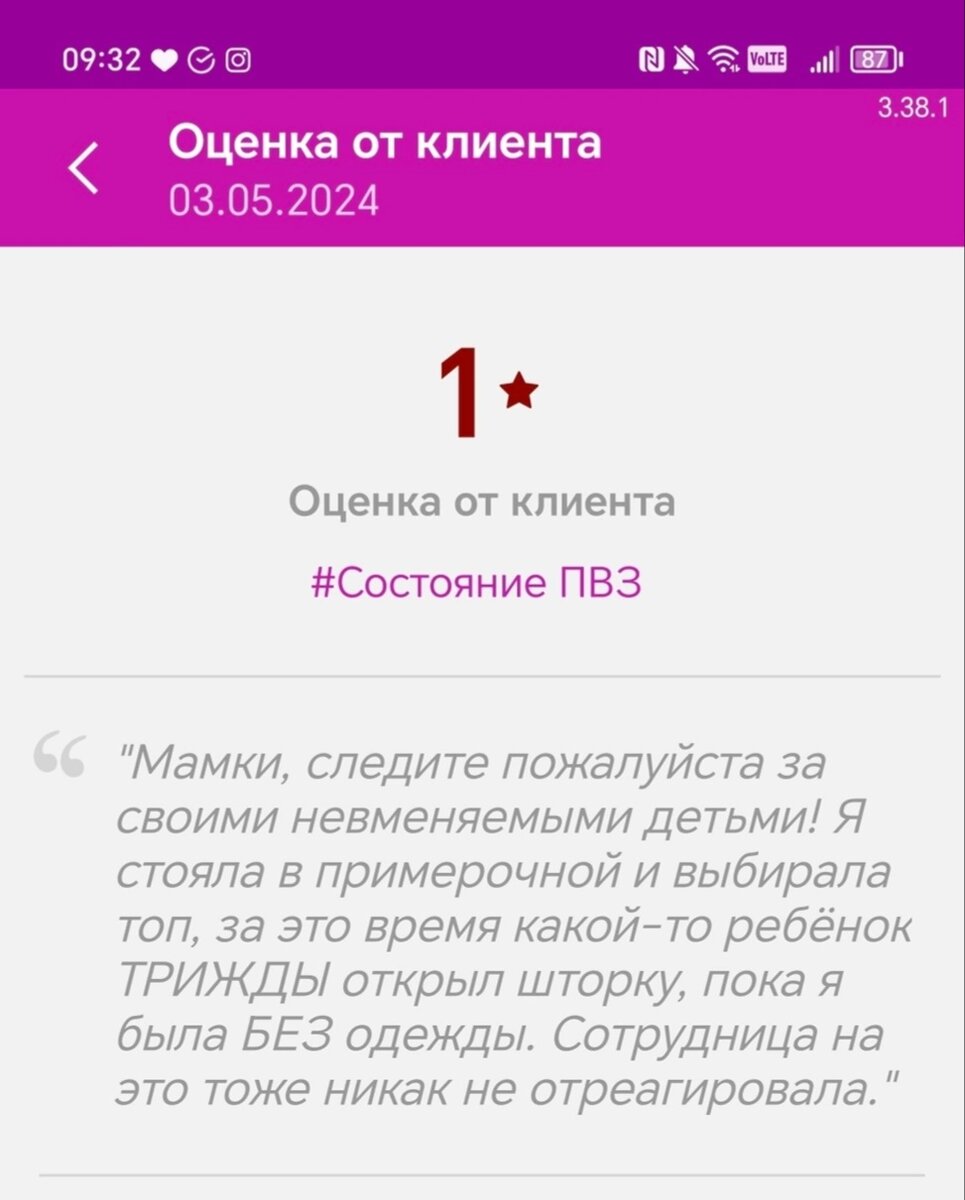1.Лицемерие клиентки: перед ней извинились, а все равно впаяла единицу.! 🤬 Воспитание некоторых клиентов ниже плинтуса! Вам хоть говори,хоть не говори, по-похорошему не понимаете,что когда вы не одни на пункте, не надо доставлять неудобства окружающим. Если некому за ребенком присмотреть или чадо непослушное, значит мама ОБЯЗАНА вести себя достойно и извиниться в случае чего. И если перед вами извинились или сделали замечание, ставить единицу после -это дно! Вести себя надо прилично,чтоб к вам претензий не было! Пвз за ваше хамство платит штрафы! Я уже писала о том,что за низкий рейтинг могут как минимум скрыть пвз,т.е.он будет работать,принимать заказы,которые уже в пути,но новые заказы другие люди не сделают.В худшем закроют пункт. Вы,клиенты, всегда на эмоциях! И ВБ на это и расчитывает! Вы будете фигачить единицы,пв платить штрафы,а Бакальчук богатеть. Забыли пословицу: утро вечера мудренее? Если ситуацию отпустить и утром может и не захочется уже писать негативный