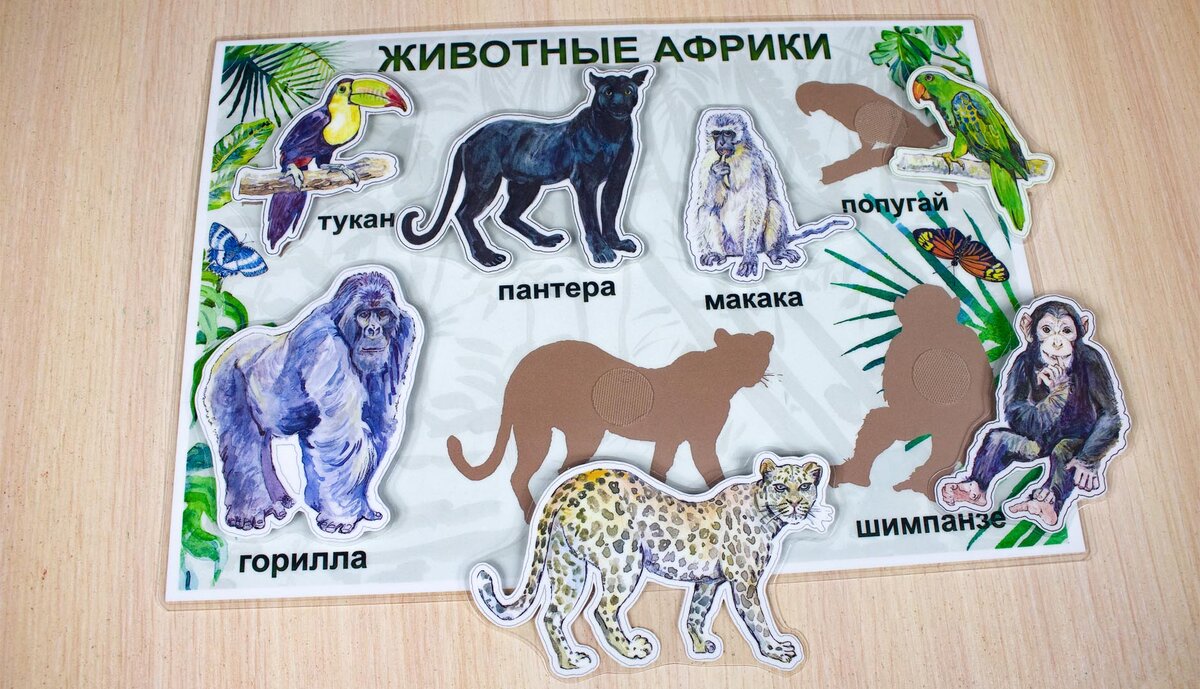 Еще одно пособие из "африканской" серии. Формат А4, плотное ламинирование основы - 175 мкм. На карточке изображены животные и птицы, которых можно встретить в африканских джунглях: три вида обезьян (макака, шимпанзе и горилла), попугай, тукан, леопард и пантера. Съёмные изображения животных ламинированы пленкой 150 мкм и фиксируются прозрачными липучками диаметром 2 см. Наша главная вдохновительница и испытательница Маруся (2 г. 8 мес) уже протестировала пособие. Техническая часть задания (совмещение изображения с тенью) в этом возрасте уже не вызывает у Маруси трудностей. Многих животных она хорошо узнает и называет, но есть новые для нее "персонажи". Не каждый день мы видим в Санкт-Петербурге тукана и гориллу... А пантеру она упорно называет "кисой". И это не удивительно. Ведь у нас живет очень похожий внешне на пантеру черный кот :) Другие фотографии лицевой стороны дидактической карточки можно посмотреть в галерее ниже: На обратной стороне дидактической карточки - задание "Находил
