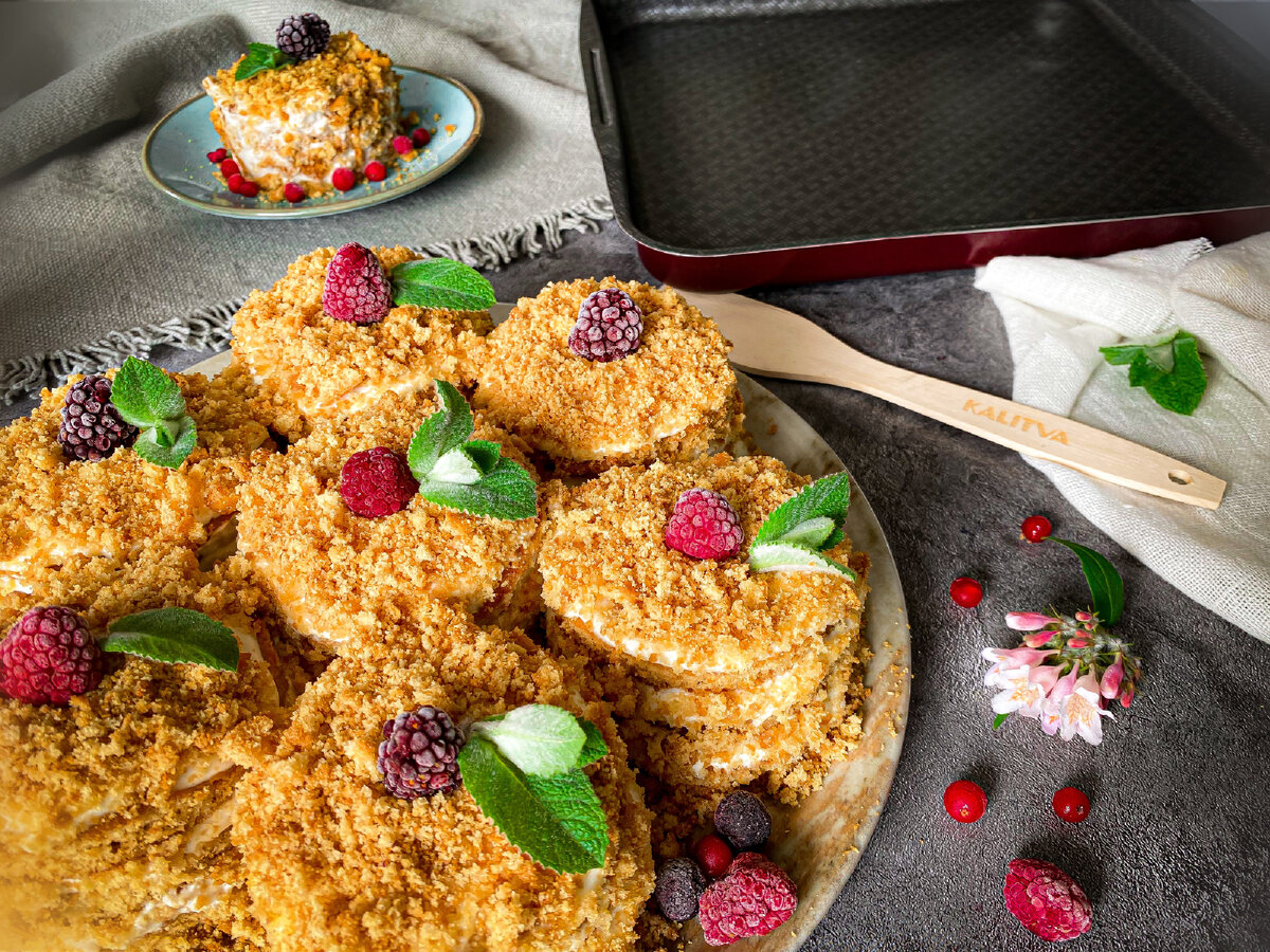 Бенто-медовички — это маленькие тортики, каждый из которых красиво лежит на блюдце. Один такой тортик можно взять с собой для перекуса, кому-нибудь подарить в качестве маленького поздравления или подарка, или же съесть дома самому — при этом тарелка будет каждый раз выглядеть аккуратно. Для восьми тортиков нам понадобится: ✅ Мед - 120 г ✅ Сода- 1 ст.л. ✅ Сахар - 150 г ✅ Сливочное масло - 130 г ✅ Яйца - 4 шт. ✅ Соль - 1 щепотка ✅ Муку - 250 г ⠀ Мед растапливаем в микроволновой печи, в растопленный мёд добавляем соду, затем миксером по очереди вмешиваем сахар, растопленное, но не горячее сливочное масло, 4 яйца по очереди, соль, последней добавляем муку. ⠀ Берём противень линейки LACE (Кружево), делим тесто на 2 части и выпекаем 2 коржа - буквально по 15 минут каждый. Нужно следить, т.к. время зависит от вашей духовки. Далее берём стальное кольцо для салатов (диаметр 10 см) и вырезаем коржи. У нас получилось 28 коржей. Обрезки от коржей мы превращаем крошку — это будет присыпка для торти