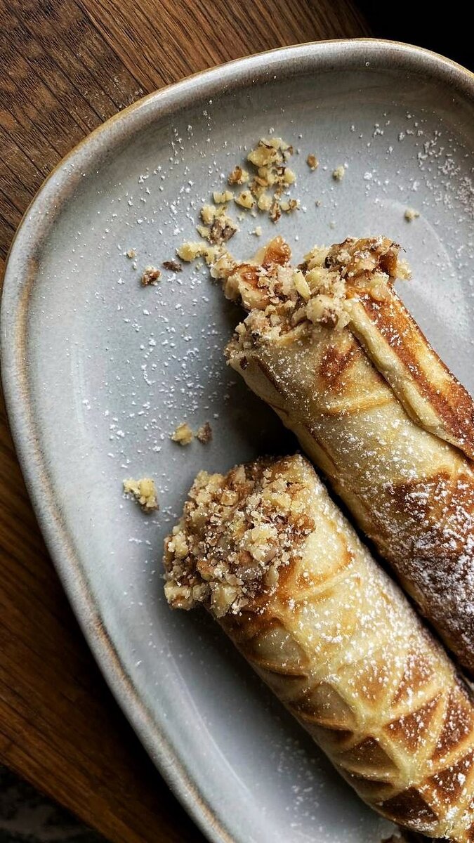 - Сахарная пудра 50 гр. Итак начнем приготовление: Тесто: В чаше миксера венчиком смешать сахар и яйца до однородности, добавить растопленное сливочное масло, размешать и добавить всю муку. Выпекаем в специальной вафельнице при температуре 200°С 1 минуту. Тесто наливаем по 60 грамм, закрываем вафельницу и сильно прижимаем для равномерного распределения теста. после выпечки вафлю скручиваем в трубочку. Крем: Сгущеное молоко нужно охладить до 2-5 градусов в холодильнике. Холодную сгущенку и сыр взбить миксером до однородности. Трубочки: Готовые трубочки начинить с двух сторон кремом с помощью кондитерского мешка. Каждый край трубочки обсыпать грецкими