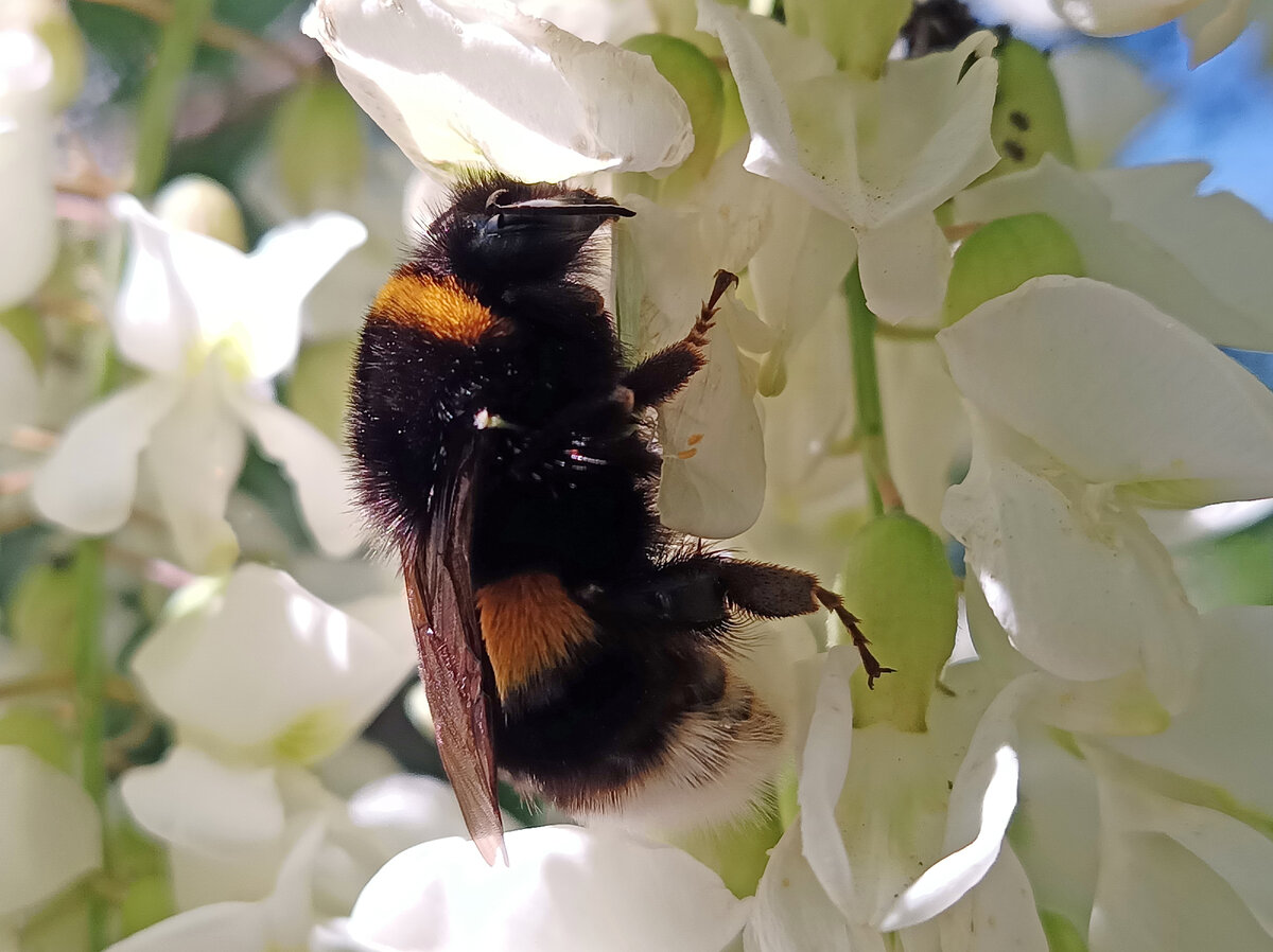 Цветущей акации в парке полным-полно. Жаль ветер уносил её аромат, иначе воздух парка был бы напоен приятным запахом цветущих деревьев. Однако ветер нисколько не мешал шмелям. Один такой попал в кадр. Он был занят своими шмелиными делами и тот факт, что кто-то его фотографировал, шмеля совершенно не беспокоил.
