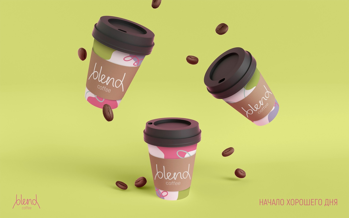 Название: Blend Coffee Сфера: Питание, кофейни Регион: Россия, Ижевск Задача Разработать уникальный логотип и фирменный стиль для новой кофейни в Ижевске, который бы отображал доступность качественного и позитивного сервиса для любого слоя населения. Концепция "Blend Coffee - начало хорошего дня." Блэнд - это смешивать, это про однородность, про то, что у персонала одинаково хорошее отношение ко всем, кто открывает двери кофейни. Всё здесь заточено на то, чтобы любой человек ушел с улыбкой и вкусным кофе, неважно студент или бизнесмен. В Blend рады всем и хотят подарить яркие эмоции каждому. Логотип Логотип основан на траектории движения ложки во время смешивания. Первая версия имела равномерную толщину из-за чего читалась как “Ыенд”, я сохранила ее для использования в качестве паттерна, но в основную версию логотипа добавила утолщения. Цвета Основные цвета светло-оливковый и розовый, а дополнительные их холодные друзья - мятный и сиреневый. Вместе эти цвета создают позитивную ярку