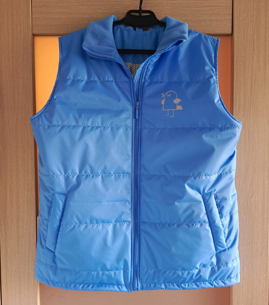 Закончила я жилетку для коллеги! Шила из дюспо красивого голубого цвета. На подкладке - фольгированная ткань. Хорошая - плотная (до этого покупала другую, она совсем тоненькая была), и рисунок симпатичный. Шила по выкройке Елены Пленкиной. Хорошая выкройка. Только карманы сделала не накладные, а с листочкой (по просьбе будущей хозяйки). Внутри ещё два кармана. Один на молнии. А другой на липучке. Но липучка не простая. В этот раз поставила пластиковую незасоряемую: Интересно, что когда заказывала ткань, не угадала с цветом молнии - она получилась светлее на несколько тонов, но дома нашлась идеально подходящая по цвету. На воротник поставила флис - так уютнее. И ещё из изменений: во все свои куртки и жилетки ставлю ветрозащитную планку. Мне так больше нравится. Ну и про светоотражайки не забыла: От пошива у меня остался небольшой кусочек голубой ткани и задалась я вопросом: может младшему сыну ветровку сшить? Вот прямо вся теперь в раздумьях надо или нет? Ветровка в Питере - спорный во