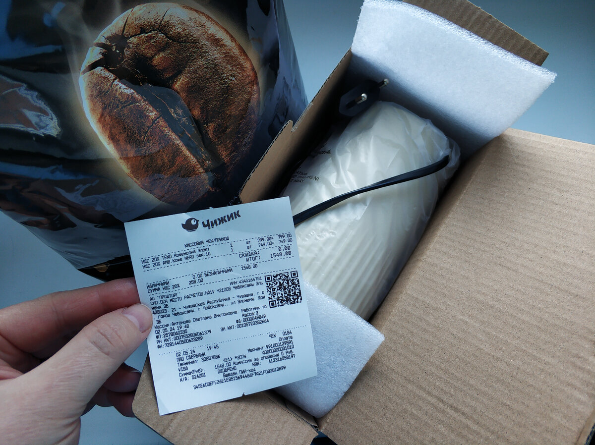 Приветствую! Я хочу вам подробно показать и рассказать о своей покупке из магазина ЧИЖИК, дать отзыв, как обычно. Это товары из последней новой партии, поэтому еще какое-то время будут оставаться актуальными на полках. Тем более кофе. Чек на покупку показываю: Кофе в огромной упаковке - целый килограмм в зернах. Но, наверное, будет лучше сначала все же показать кофемолку в работе. Некоторые характеристики с коробки для начала: Сама кофемолка меня немного удивила почти сразу. Выглядит, как термокружка, симпатичная. Кстати, в отличие от некоторых других китайских товаров (тот же пылесос из прошлых моих покупок) здесь подробно все описано - как пользоваться, как ухаживать и т. д. Инструкцию наснимала, покажу: На коробке была отметка ЗАЩИТА ОТ ПЕРЕГРЕВА. А здесь в инструкции не совсем так. Защиты как таковой нет, а самой надо следить за временем непрерывной работы. Молоть кофе можно в течение минуты и обязательно сделать перерыв не менее минуты, чтоб дать время моторчику остыть. Да