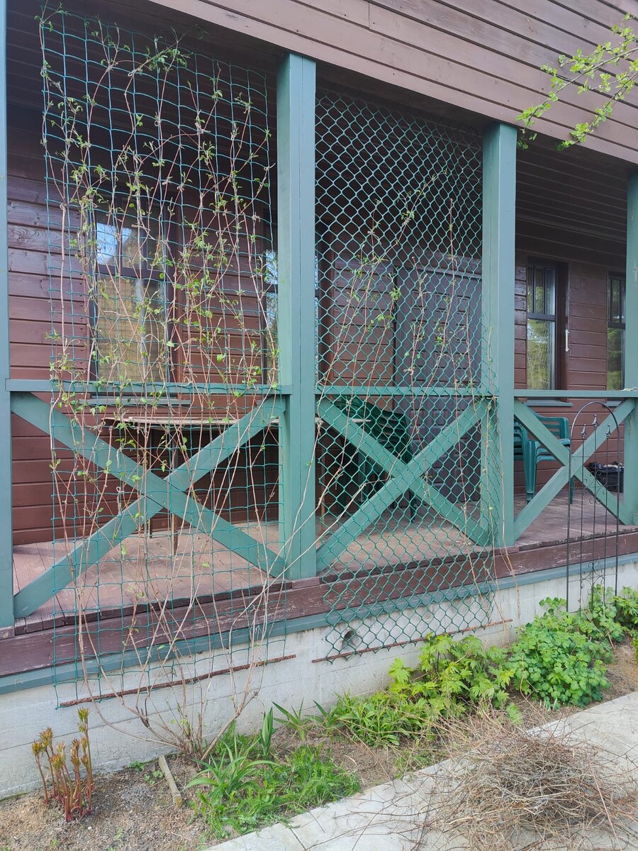 Почти целый день дефицитного весеннего времени пришлось посвятить обрезке двух взрослых клематисов витицелла. Они вьются по сетке, закреплённой под потолком террасы. Верхняя часть побегов клематиса зимой погибает, а от нижней части отрастают новые побеги. Сухие побеги можно оставить необрезанными, но это будет некрасиво. А если не обрезать их несколько лет, то это вовсе будет смотреться неряшливо. Поэтому я обрезаю их ежегодно, в самом начале мая. Эта работа ужасно нудная. Нужно проследить, до какого места побег остался живой, обрезать высохшую часть и аккуратно вытащить её из переплетения с другими плетями. При этом нужно не повредить почки и другие, молодые побеги, уже тронувшиеся в рост. Раньше обрезку делать нельзя, так ещё не видны все оставшиеся в живых почки. И позже тоже нельзя, иначе обломаются молодые побеги, ведь они очень хрупкие. В процессе обрезки требуется подвязка к сетке вновь отрастающих побегов, ведь пока они сами не зацепились за опору, они могут повиснуть и об