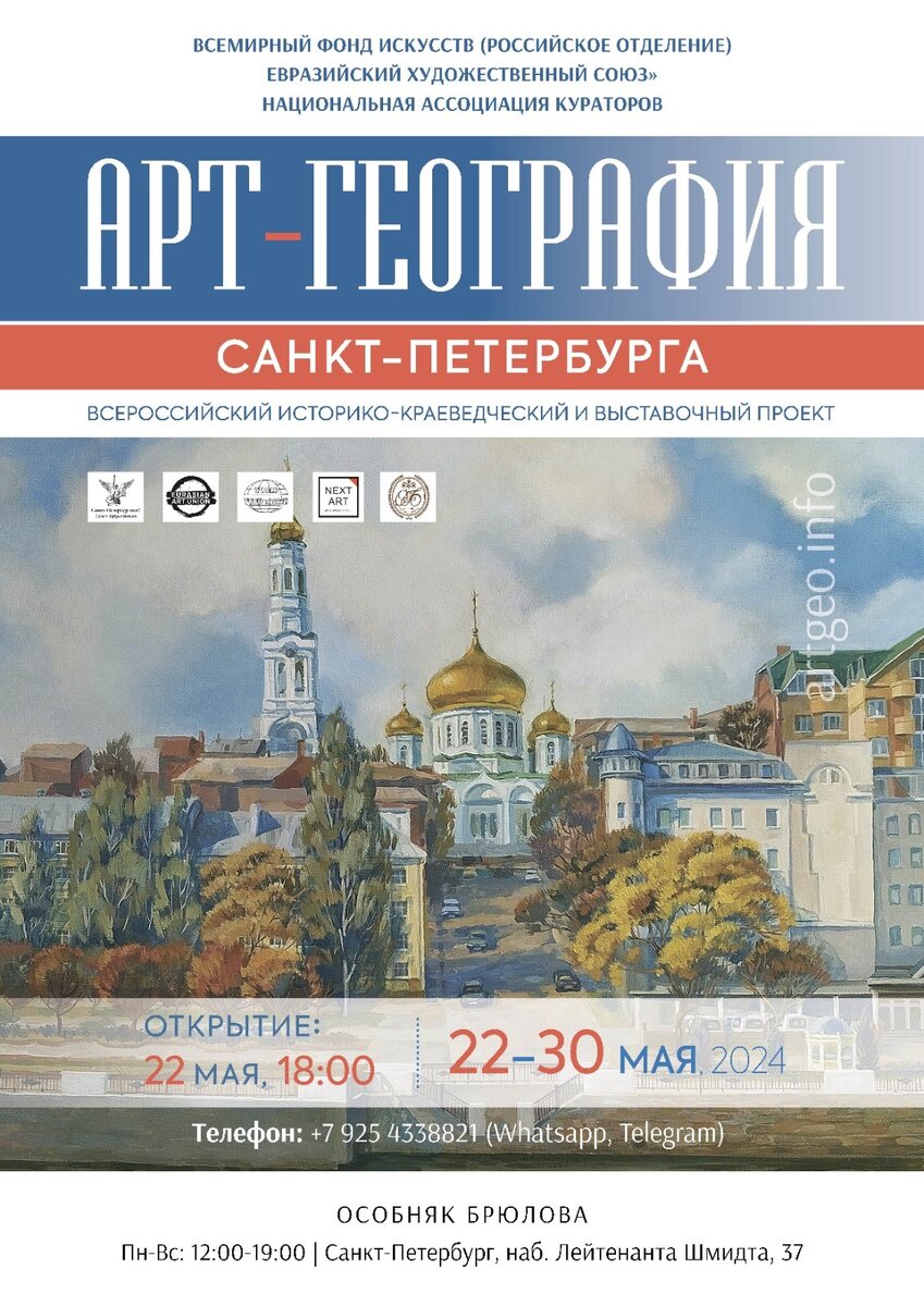 Уважаемые художники, ценители и любители искусства! Всемирный фонд искусств (Российское отделение), Национальная ассоциация кураторов и Евразийский художественный союз объявляют об открытии приема заявок на участие в историко-краеведческом проекте «Арт-География Санкт-Петербурга и Ленинградской области», который проводится в рамках федерального проекта "Арт-География России". Приглашаем Вас разместить свои произведения в государственном музее! В программу входит два самостоятельных проекта: АРТ-ГЕОГРАФИЯ ЛЕНИНГРАДСКОЙ ОБЛАСТИ и АРТ-ГЕОГРАФИЯ САНКТ-ПЕТЕРБУРГА. Экспозиция произведений искусств, посвященных архитектуре, природе и людям, проживающим и внесшим вклад в культуру и историю Ленинградской области - АРТ-ГЕОГРАФИЯ ЛЕНИНГРАДСКОЙ ОБЛАСТИ - будет размещена в самом центре Северной столицы, в знаменитом особняке Брюллова: Россия, Санкт-Петербург, наб. Лейтенанта Шмидта, 37. В 1840-1873 г. особняк принадлежал зодчему Александру Павловичу Брюллову. В Белом зале особняка проводили музык