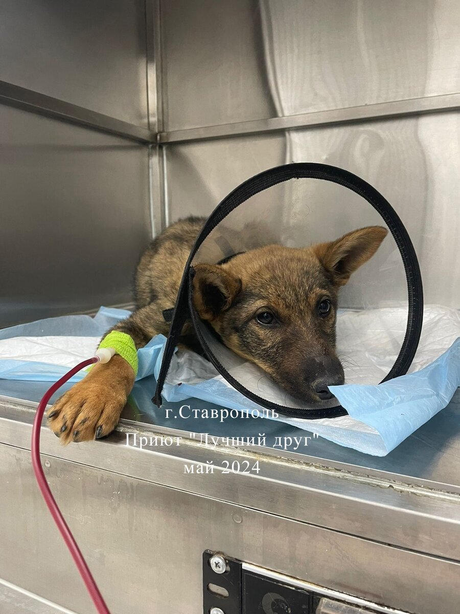 Через несколько дней щенка доставили в Ветцентр на Серова. Открытый перелом, некроз, нагноение, лапу нужно ампутировать, спасать ее уже поздно. Щенок ослаблен, в нынешнем состоянии операционный наркоз не перенесет, нужно стабилизировать ее состояние. Ксана остается на стационаре, вечером ей возили донора для переливания крови, врачи борются за ее жизнь. Держите кулачки за девчушку, ей очень нужна ваша моральная поддержка. От материальной поддержки мы тоже не откажемся, лечение у Ксаны будет долг