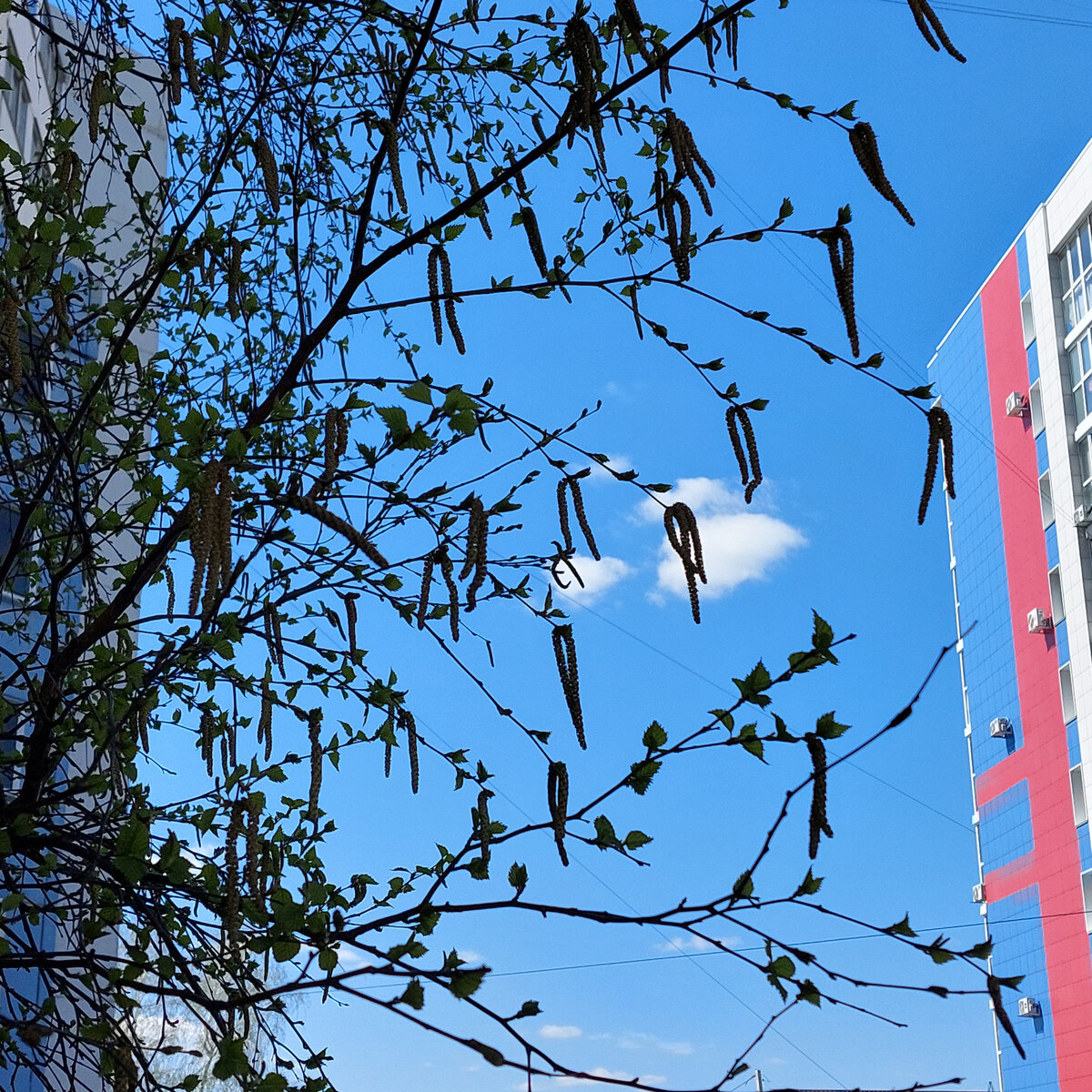 Вот так у нас сегодня около подъезда береза выпустила нежные листочки и длинные сережки. День яркий, а я осталась дома.