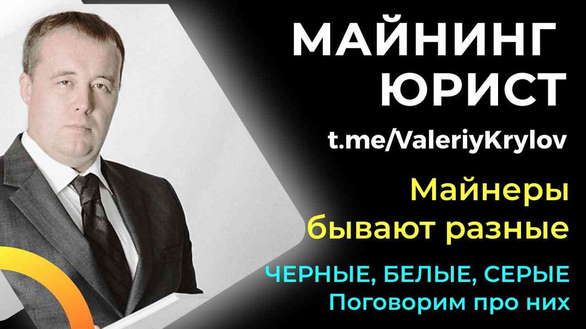 Есть майнеры черные - это те, кто воруют электроэнергию у других граждан и организаций. У них только одна дорога - на скамью подсудимых. Есть белые майнеры - организации, официально подключенные к сетям и платящие коммерческий тариф. А есть серые майнеры - те, кто по любопытству, глупости, жадности начал майнить. А еще в категорию серые майнеры попадают абсолютно честные люди понятия не имеющие что такое майнинг. Им только за "шум вентилятора" и небольшое повышение потребления энергии выставляют космические счета и заставляют по суду их платить. Про все эти категории мы поговорим в данном видео. Да, кстати, для тех, кто со мной не знаком, меня зовут Валерий Крылов, по образованию я юрист, живу в Иркутске. Имею много профессий и хобби. Так, я Майнинг юрист по спорам с электросетями. Выиграл огромное количество дел с Энергосбытом на большие суммы. А еще я предприниматель, инвестор и учредитель нескольких компаний. Я писатель и автор книги «Ученик Олигарха. Квантовое инвестирование». В