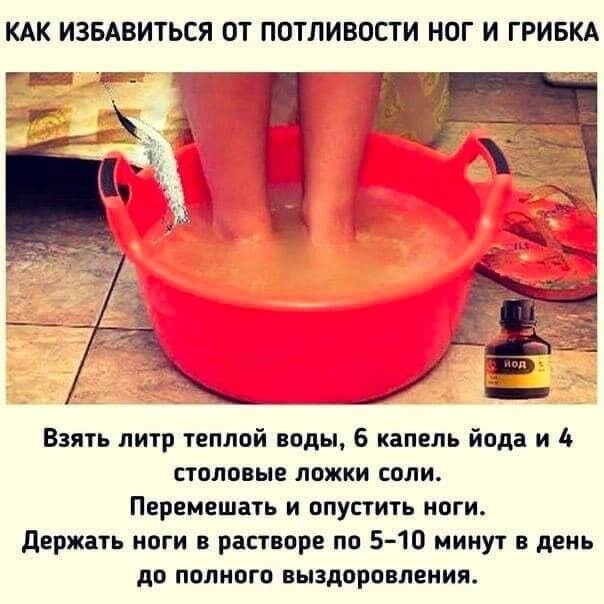 💥1 литр теплой воды💥6 капель йода💥4 столовые ложки солиВсе перемешайте, подержите ноги 5-10 минут и примите ванну.