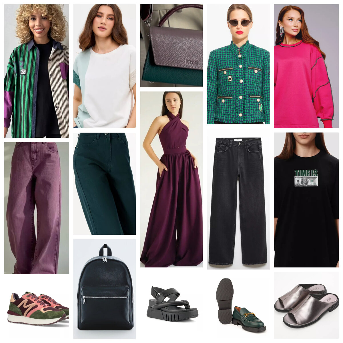 К капсуле хотелось добавить яркого, поэтому и кроссовки заметные и свитшот хорошо виден в наборе. Особенно редко когда вот так на одной вещи сочетают такие цвета как фуксия и зеленый. Поэтому и решение добавить изумрудные джинсы. Сумка кстати найденная все решения поддержала.