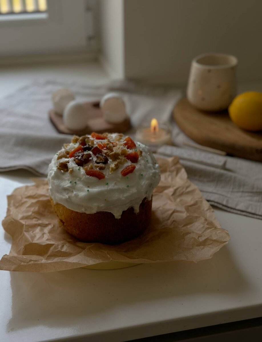 Ингредиенты: Творог 9% - 180 гр. Яйца - 3 шт. Мука 200 гр. Размягченное сливочное масло - 150 гр. Сахар - 100 гр. Крахмал (любой) - 70 гр. Разрыхлитель - 2 ч.л Смесь сухофруктов + орехов по желанию - 100 гр. Цедра лимона - 1шт. Пару советов перед приготовлением: °Формы для кексов заполняйте на половину или 1/3 (они поднимутся, чтобы не вытекли в духовке) °Ставьте кексы в разогретую до 180 градусов духовку °Первые 30 минут не открывайте духовку °Готовность проверьте деревянной шпажкой (на ней должно оставаться тесто) Приготовление: 1.Заливаем горячей водой сухофрукты и оставляем на 10 минут. 2.Сливаем воду, сухофрукты промакиваем полотенцем, если нужно, нарезаем и добавляем к ним 1 ст.л муки. Перемешиваем 3.Творог протрите через сито или измельчите блендером. В отдельной миске смешайте яйца, сахар, взбейте миксером до пышности. 4.Добавляем творог, цедру лимона, сливочное масло, перемешайте блендером. Добавляем крахмал, муку, перемешиваем. Добавляем сухофрукты, перемешиваем