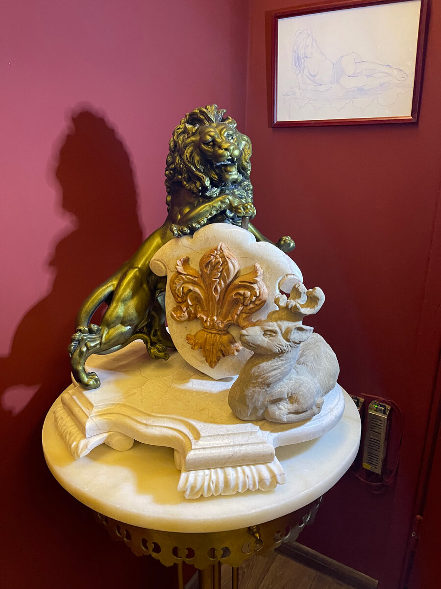 Как - то в антикварной лавке обратил внимание на этого французского льва из Европы ( шпиатр) . Авторство не установить, но потом родилась идея поставить на этот старинный латунный столик данную композицию . Косулю сделал из мрамора , столешницу и подставку тоже из мраморов, и так гербовый лев приобрел свою лиру!)))