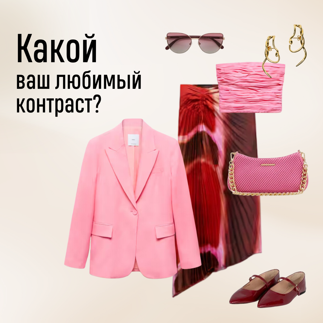 Образ воспринимается гармонично, когда в его элементах есть подобие: повторяются цвета и формы, плавно перетекают оттенки. Зачем тогда вообще нужны контрасты? А без них скучно. Фиолетово-желтые анютины глазки, красные тюльпаны с черными тычинками, желтое солнце на синем небе. Не говоря уже о закатах с рассветами. Контраст – это резкая противоположность. Они притягивают взгляд, задерживают его на себе. Контраст может быть: 🔴🟢по цветовому кругу – противоположные в круге цвета, которые в смеси дают серый: белый + черный, фиолетовый + желтый и так далее. ⚪️⚫️по светлоте: светлые и темные оттенки. На этом построены образы с растяжкой цвета: например, розовый в бордо, синий в голубой, бежевый в коричневый. Это дает «дорогой» эффект. 🟠🟤по яркости: яркий – мягкий. Тоже можно делать растяжкой, например, хаки и цвет ярко зеленой травы. Но может быть, как у нас в галерее, базовая джинса + любой цветовой акцент. Мягкий цвет «успокаивает» яркий. ⚫️🔴хроматический + ахромат (белый, серый, черный