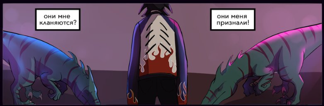 Супер, теперь у меня есть маскировка. Даже увереннее стал себя чувствовать. Можно топать домой. Вот только как это сделать? А ладно, пойду просто вперёд, а там глядишь, как-то дойду до куда-то. Но сил теперь реально будто бы больше. И уверенности. Раньше я бы стал сразу же ныть и звать Бо на помощь, а теперь хочется самому постараться во всём разобраться. Так и сделаю. Интересно, что стало с тем челом, который пытался меня убить? Там же везде была кровь. Хммм, может я сам его... Так, ладно, пока не думать об этом, с этим разберёмся позже, сейчас надо выбираться. Надеюсь всё норм. А если и не норм, то какая нахер разница, он напал на меня. А у меня была самооборона. Странноватая с яркой вспышкой, но всё же? Топ-топ по лестнице, поднимаюсь к себе домой, сил уже никаких нет абсолютно. О, кажется мои коты-динозавры ждут меня. Фига, что это с ними, они мне кланяются? Они меня признали? Подчиняются мне? Кажется, всё дело в моей маске динозавра. Кажется, я обретаю суперсилы. Кажется, я обрета