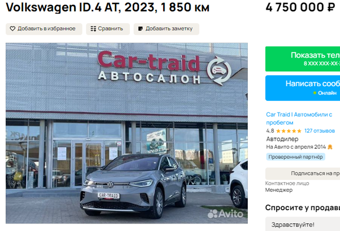 В автосалоне "Car Traid" на ул. Космонавтов в продаже два электромобиля с пробегом. Первый из них - это полноприводный VW ID.4: