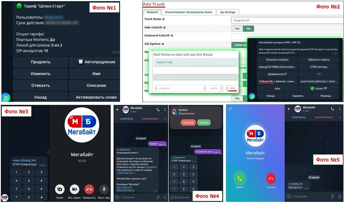 Переадресовать вызовы клиентов в Telegram ваших сотрудников или позвонить клиенту в Telegram - сегодня расскажем о том, как мы реализовали в нашей ИТ-компании интеграцию корпоративной телефонии со звонками через популярный мессенджер. Что требуется: IP-телефония и аккаунт в Telegram. Как это работает: аккаунт в Telegram выполняет роль шлюза (SIP-транк) между мессенджером и вашей АТС. Что мы используем: сервис создания Telegram-шлюза и телефония Asterisk. Подойдет любой провайдер облачной АТС. Наши действия: 1. Подключаем тариф «Шлюз» с помощью Telegram-бота сервиса, выбираем необходимое количество линий и срок подписки (Фото №1). 2. Настраиваем уже готовый к работе шлюз на нашей АТС и маршрутизацию входящих и исходящих вызовов. В нашем случае для удобства мы используем префикс для исходящих звонков, что позволяет нашей АТС легко отличать звонки в Telegram от обычных (Фото №2). 3. Звоним на аккаунт в Telegram и попадаем прямиком на городской номер нашей компании. Переадресовываем вызов