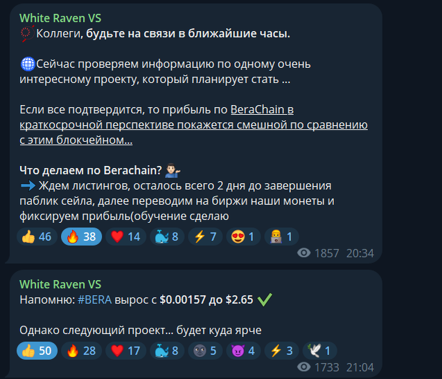 Сразу скажем всё основное, тг канал White Raven - скам, не верьте не единому слову, по возможности отправьте жалобу на него. В нём распространялись 2 токена, BERA и BOUNCE. Оба являются скамом!