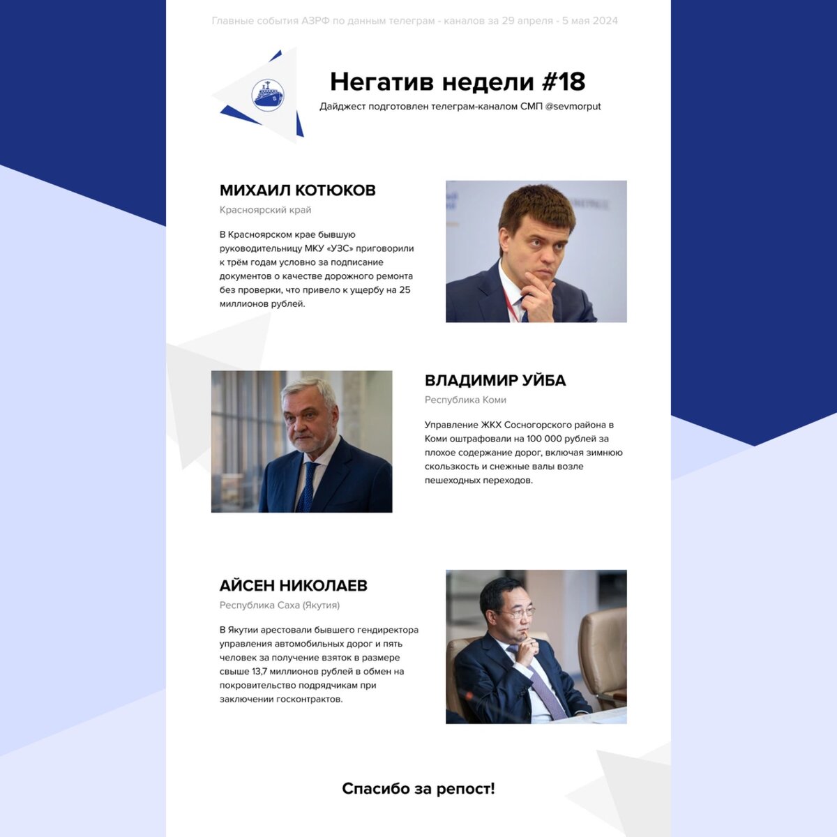 Представляем еженедельный рейтинг «Главы АЗРФ — Негатив недели. Неделя 18» Михаил Котюков В Красноярском крае экс-руководителя МКУ «УЗС» приговорили к условному сроку за злоупотребление должностными полномочиями при приемке дорожных работ. Она подписывала документы, подтверждающие качество ремонта, не проведя фактической проверки качества асфальтобетонной смеси, что стало причиной нанесения ущерба местному бюджету на сумму 25 миллионов рублей. Суд назначил ей три года условно с испытательным сроком два года. Владимир Уйба Управление ЖКХ Сосногорского района в Коми оштрафовано на 100 000 рублей за нарушение правил содержания автодорог. Суд установил, что на дорогах была зимняя скользкость, снежные валы высотой более 0,5 метра, а также снежные насыпи близко к пешеходным переходам. Нарушения были зафиксированы 14 февраля 2024 года. Штраф пока не вступил в законную силу. Айсен Николаев В Якутии задержали бывшего гендиректора управления автомобильных дорог и действующего депутата парлам