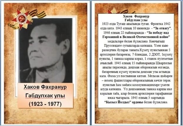Наш дедушка Фахранур Габдулхакович Хаков родился в 1923 году в Муслюмовском районе. На фронт его призвали в 1942 году. В июне 1943 года был награжден медалью «За отвагу», в марте 1945 года – «За победу над Германией». Габдулхак Хаков участвовал в войне в Восточной Пруссии. Проявил себя бесстрашным разведчиком. В марте 1945 года удостоился ордена «Красной Звезды». Лейсан Яруллина, сотрудница Амировской начальной школы-детского сада #МойГеройМояСемья Подробнее: https://nashcheremshan.ru/news/znayte/gabdulxak-xakov-proiavil-sebia-besstrasnym-razvedciko