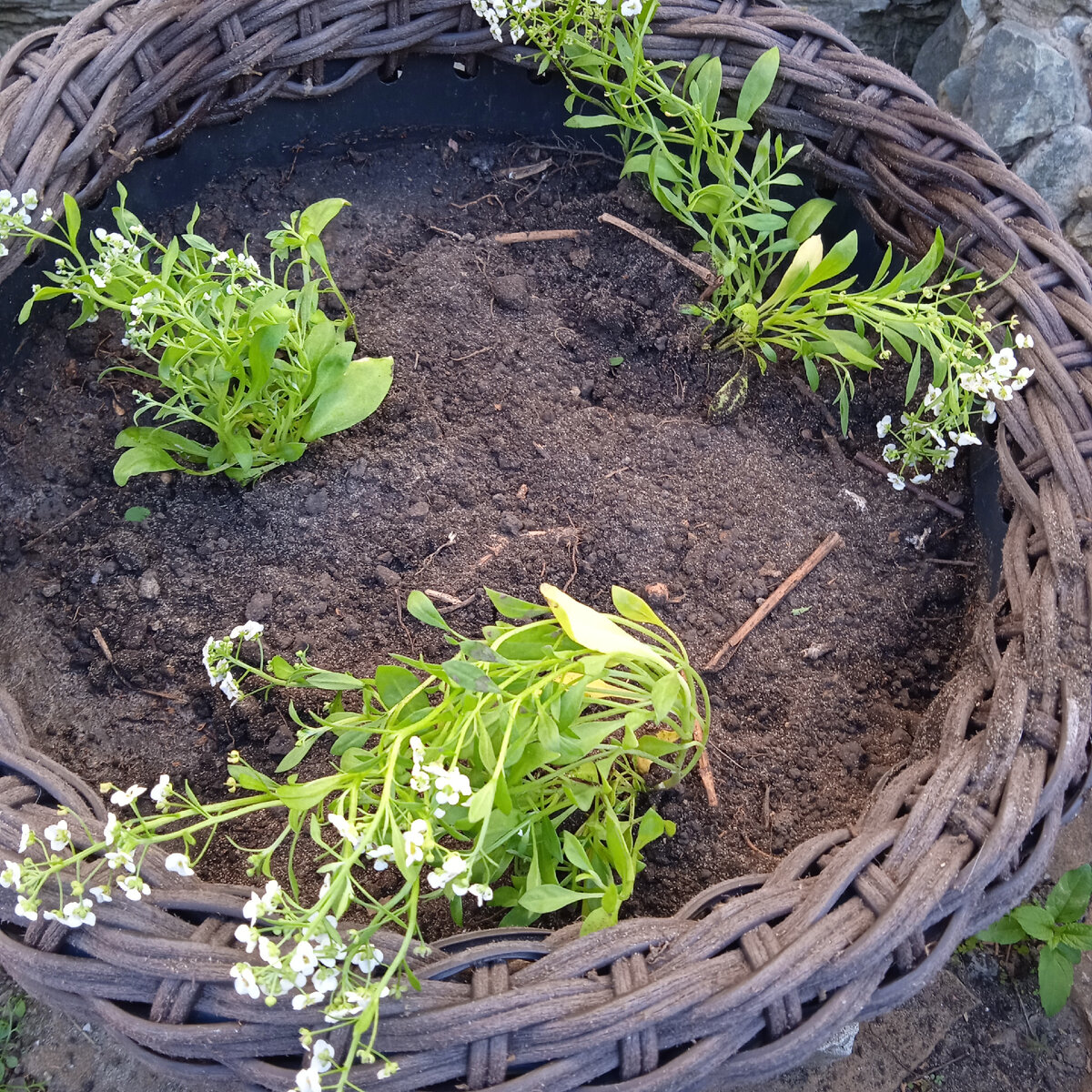 Не откладывая в долгий ящик, принялась сегодня за реализацию задуманного. Ну, а вот с чего начать,еще тот вопрос. Сложнее всего для меня, определиться с местом расположения композиций. Чтобы она органично вписалась и при том , никому не мешала. А то , запросто может оказаться перевёрнутой вверх дном Этот вопрос, благополучно разрешился! Сначала вынесла свои два ротанговых кашпо, которые я приобрела прошлым летом. Алиссумы тоже были куплены заранее. Решила сразу и посадить. Мне мужик два в подарок дал, пришлось третий их своих всходов досадить. Боюсь , только он будет другого цвета. У меня много самосева взошло. Кашпо поставила около "карманов". А в "карманы" посадила пеларгонию.. Когда Алиссум наберет силу, будут вот такие шарики. Это входная зона, мне так нравится. Пока это выглядит скромненько. И у меня большие претензии к "карманам". Хотя есть идея их подшаманить! Когда с этими управилась, решила подготовить более существенную тару. Мне тут в комментариях писали, что тесно бу