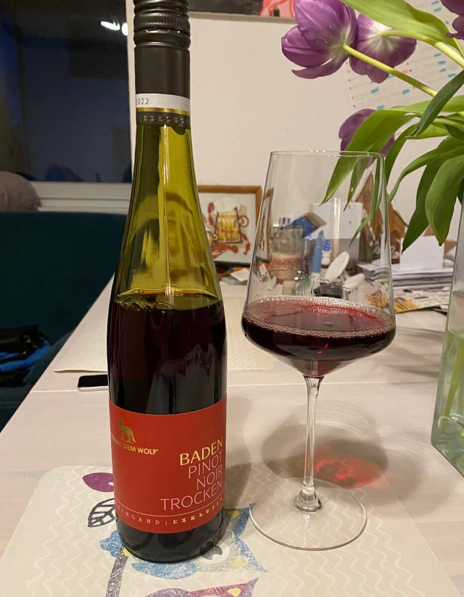 Сначала показалось что вино пахнет козьим сыром, дымом и ваткой со спиртом, то ли с йодом. А потооом, минут через 30-40 в бокале стало пахнуть ароматизатором малины, а потом ее убила вишня. А козий сыр превратился в сухофрукты для компота, только шеф в столовой решил еще добавить шиповник. А на вкус вишня в шоколаде, которая немного вяжет рот, такая конфета из горького шоколада с несладким вишневым ликером. Для меня слишком терпкое для такой плотности. Вообще как водичка. Der mit dem wolf Baden ~1000 #выпилизабыл #пинонуар