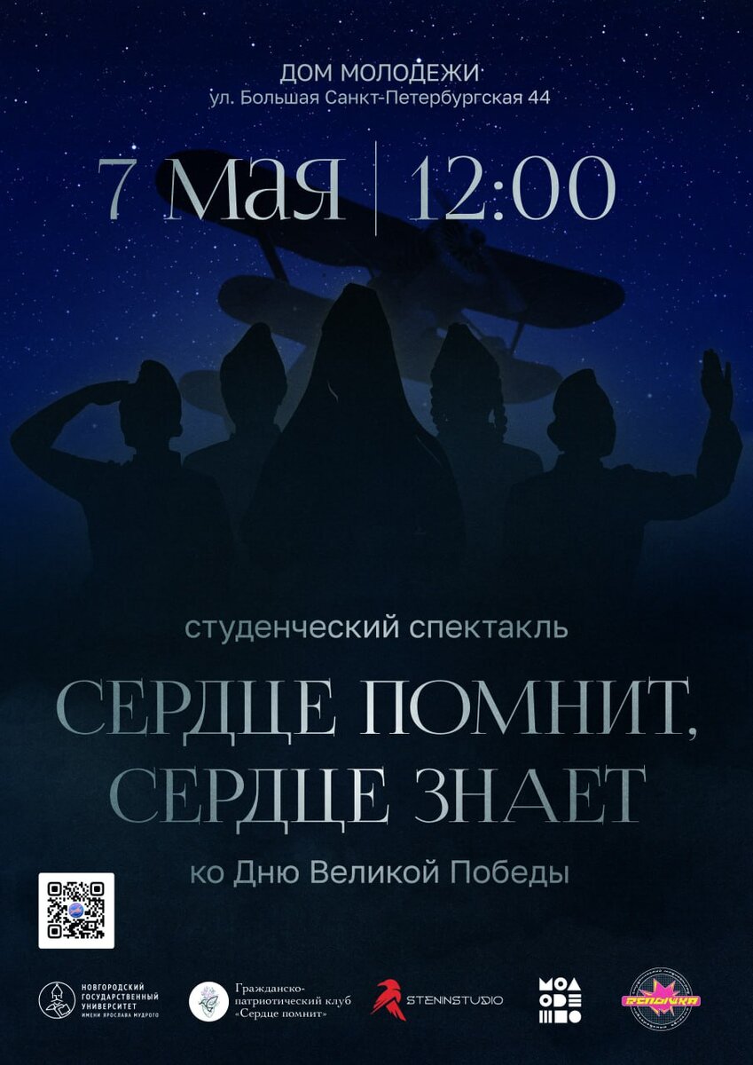 7 мая в Доме Молодёжи пройдёт спектакль «Сердце знает, сердце помнит», приуроченный ко Дню Победы. В постановке принимают участие студенты НовГУ, учащиеся школ Великого Новгорода. В основу постановки положена история 46-го гвардейского ночного авиационного полка. Во время Великой Отечественной войны преимущественно в ночное время летчицы бомбили позиции немецких войск и коммуникации противника, и немцы стали называть их «ночными ведьмами». Организатором спектакля является специалист по работе с молодёжью отдела поддержки студенческих сообществ Дария Баранова. — Важно то, что у каждой героини в спектакле есть свой реальный прототип, — рассказала Дария Баранова. — Их образы мы составляли на основе мемуаров самих лётчиц, писем и записок их дневников. Спектакль состоит из двух частей, в которых зрители смогут увидеть героинь в довоенный период и во времена боевых действий. Спектакль «Сердце знает, сердце помнит» проводится с 2023 года. В прошлом году Дария Баранова стала победителем област