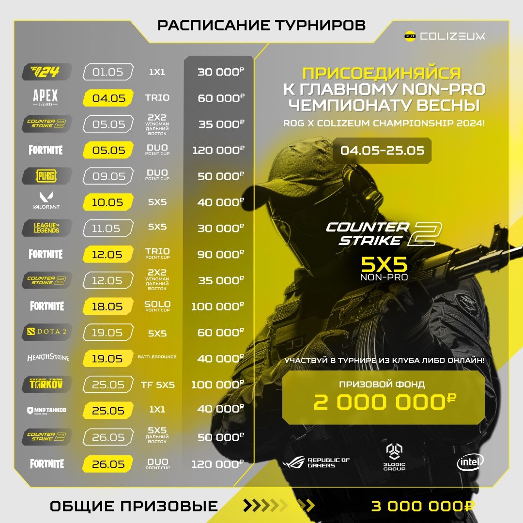 Представляем вам расписание турниров на май от COLIZEUM Парк Победы! В мае пройдет крупнейший NON-PRO чемпионат этой весны - ROG X COLIZEUM CHAMPIONSHIP 2024, с призовым фондом в 2 000 000! Участвовать в данном турнире можно как из клуба, так и онлайн, квалификации стартуют уже 4-го мая, успей зарегистрироваться! Подробную информацию о каждом турнире, а также правила и регистрацию можно найти по ссылке. Регистрируйся, приходи в клуб COLIZEUM и врывайся в киберспорт!