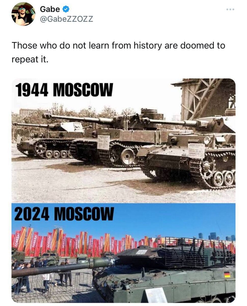 На Западе активно распространяется вот эта картинка. Это не история, это наша с вами современная жизнь. Я вот в своем ТГ-канале сегодня видосик разместила. Репетиция парада Победы на Красной площади. Вроде все как всегда. Только маршируют солдаты уже не под «Катюшу», а под «Группу крови» Цоя. Перепоказываем.