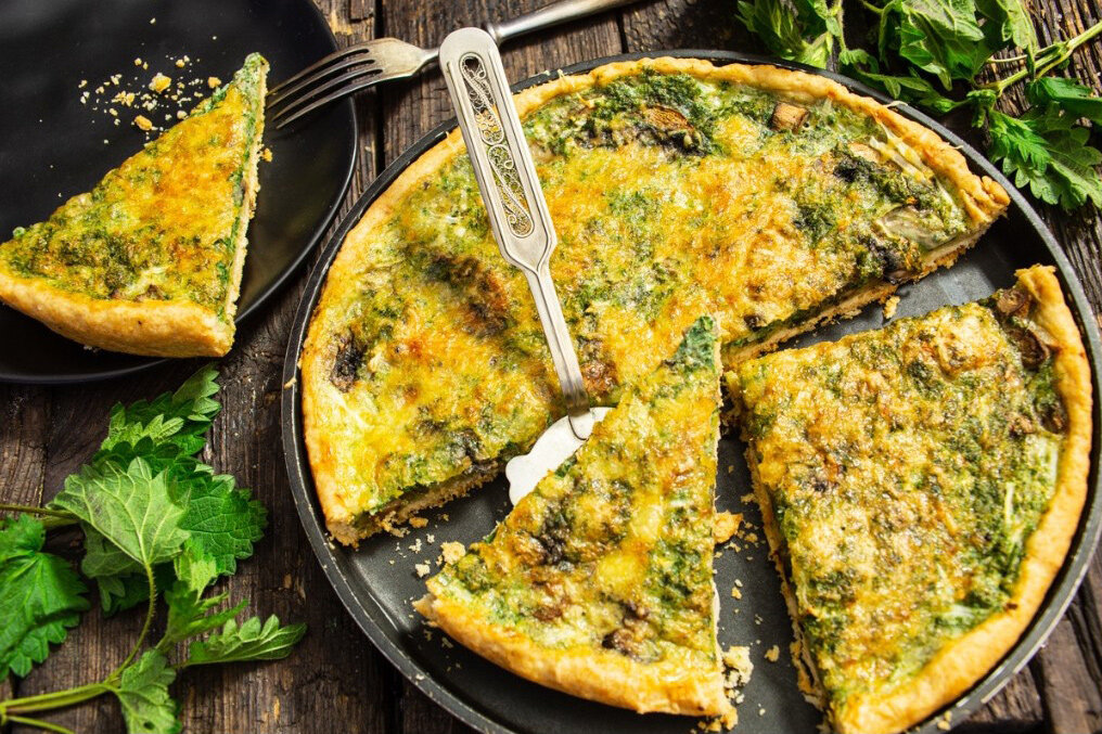 Этим рецептом с нами поделилась наша давняя читательница Валентина Червонная. Весной она всегда печет этот пирог и угощает им не только родных, но и соседей. Ингредиенты для теста: 250 г пшеничной муки, 85 мл растительного масла без запаха, 85 мл воды, 1 ч. л. разрыхлителя, 0,5 ч. л. соли. Для начинки: 150 г свежих шампиньонов, 1 средняя репчатая луковица, 100 г крапивы, 2 куриных яйца, 150 мл молока, 1 ст. л. крахмала, 40 г твердого сыра, соль по вкусу. Замешиваем тесто Смешиваем пшеничную муку с разрыхлителем, просеиваем смесь в глубокую миску и делаем в ней углубление. Вливаем туда растительное масло и растворенную в теплой воде половину чайной ложки соли. Быстро замешиваем тесто, оно должно получиться мягким и эластичным. Готовим «корзину» Раскатываем тесто на рабочем столе и накручиваем на скалку. Переносим в форму размером 25 см. Разравниваем тесто по дну формы и бортикам, срезаем лишнее, пальцами выравнивая бортик одинаковой толщины. Выкладываем шампиньоны Свежие шампиньоны обти