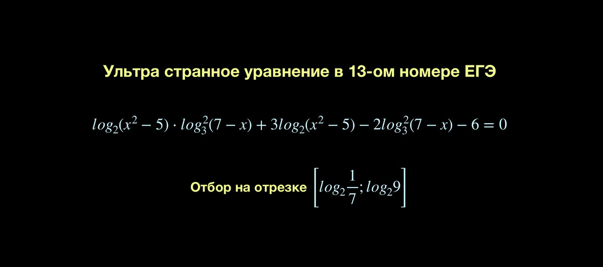 Здравствуйте! Сегодня решим нетипичное для ЕГЭ задание и выясним, почему на экзамене его НЕ БУДЕТ. В школах все чаще слышно "заходи на решу егэ, делай все подряд, это ТОЧНО встретиться на реальном экзамене". Перед вами один из таких примеров, который "точно-обязательно-наверняка" уже ждет своего часа быть напечатанным в КИМ. Я решу его подробно и пошагово, а в конце постараюсь доказать невозможность встречи с таким уравнением на экзамене и успокоить итак нервничающих сдающих. Поехали! Решение уравнения У нас логарифмы => первая автоматическая мысль, которая должна посетить - ОДЗ! Исследуем область допустимых значений. Что будем делать дальше? Например, видно, что у нас всего два одинаковых логарифма. Скорее всего, подразумевается метод группировки. Сделаем замену и посмотрим, что из этого выйдет. Дополнительное примечание: второй логарифм изначально был в квадрате и заменялся тоже с квадратом. Так вышло, что n=-3, а число в квадрате не может быть отрицательным. Пустое множество.