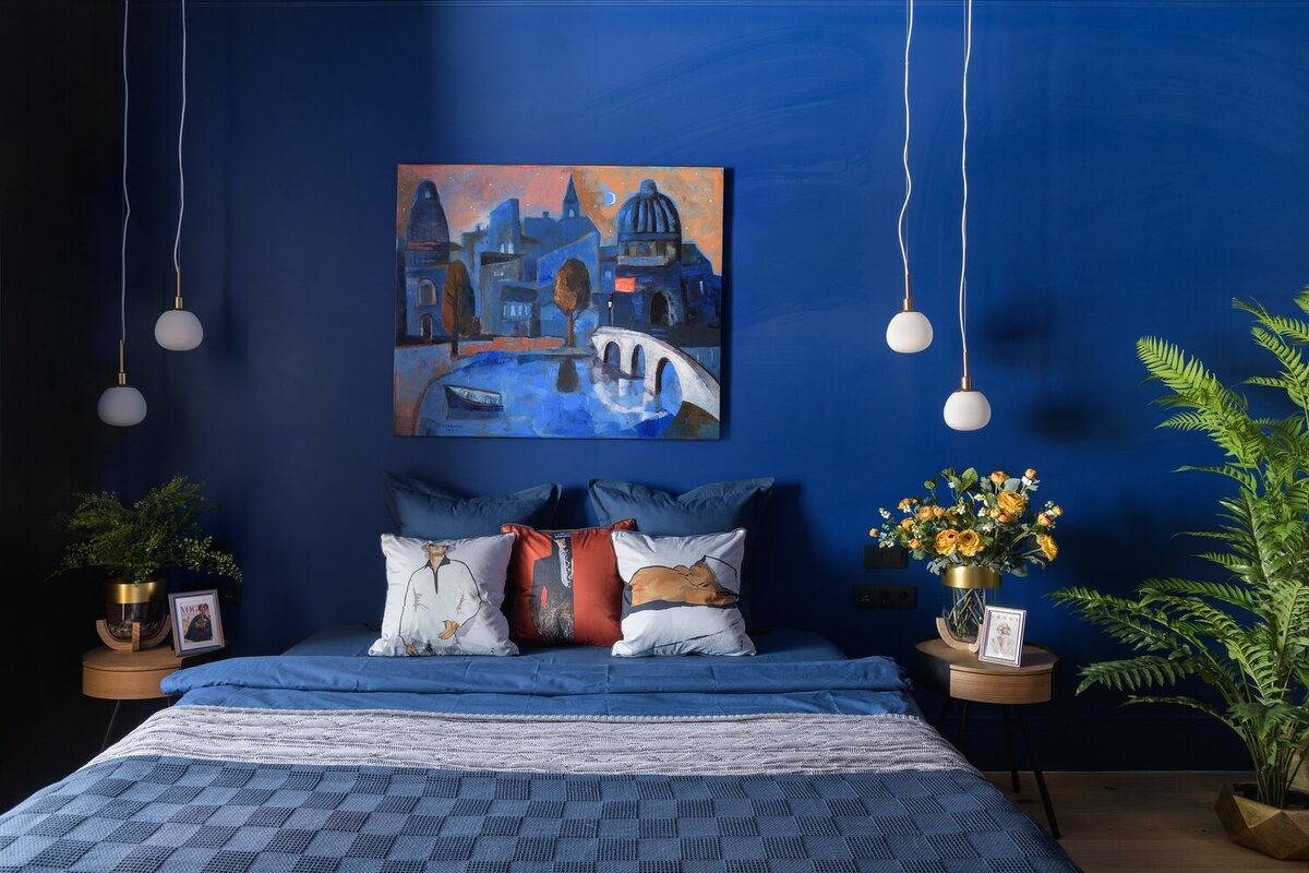 Благодаря выбору достаточного темного оттенка краски для стен и потолка в спальне удалось создать камерную атмосферу. Чтобы не возникло давящего эффекта, интерьер разбавили деревянной мебелью, текстилем и декором. Добиться симметрии помогли одинаковые подвесы и вазы на прикроватных тумбах. В ходе перепланировки предусмотрели нишу у входа, в которой разместили стеллаж для книг.