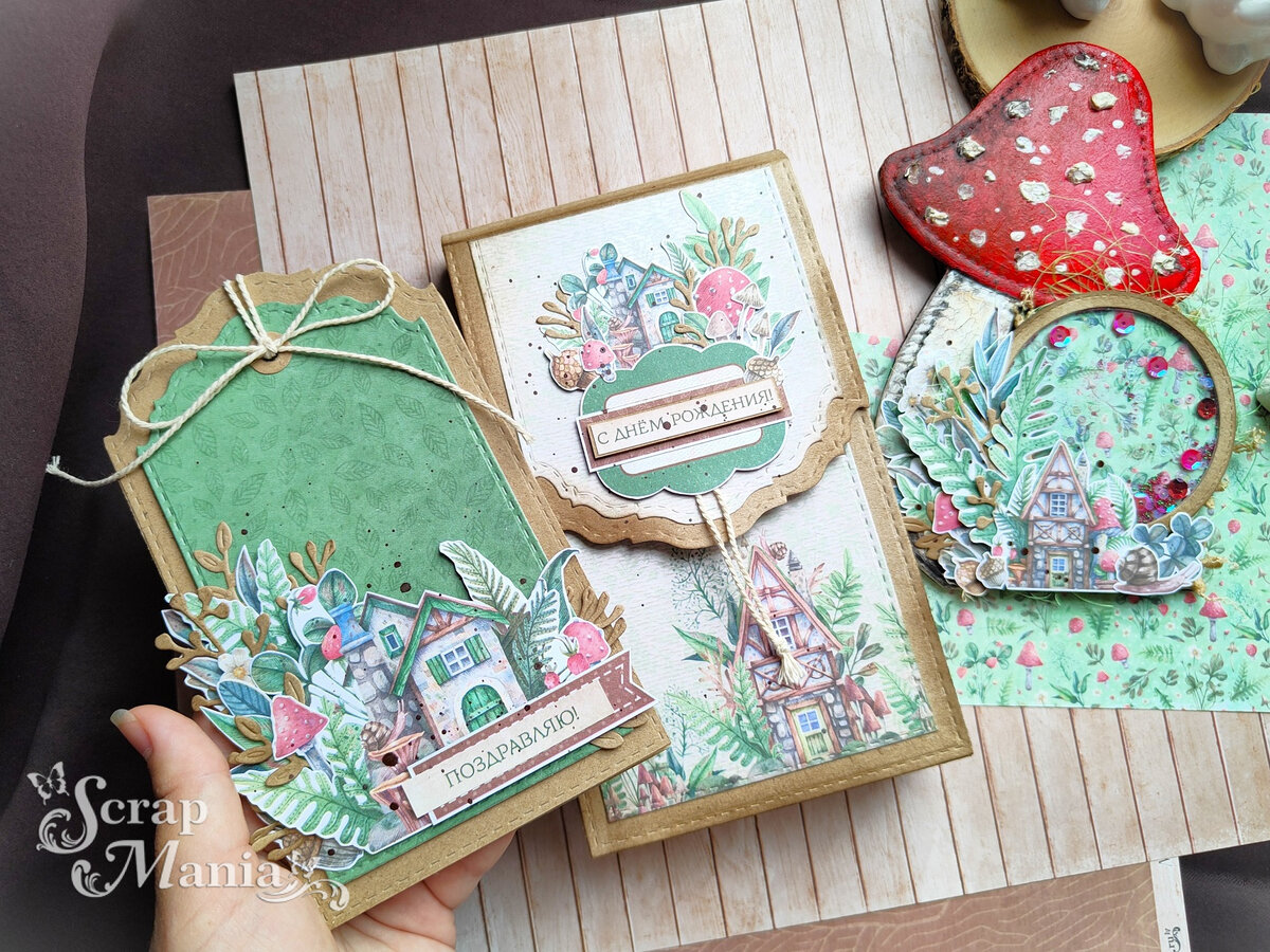 Всем-всем привет! Сегодня с вами Надежда Горбач. Хочу показать вам милый подарочный наборчик на день рождения, состоящий из упаковки под подарок, магнита в форме грибочка и, конечно же открытки. Ну, что? Вы догадались какая у меня коллекция в деле? ))))