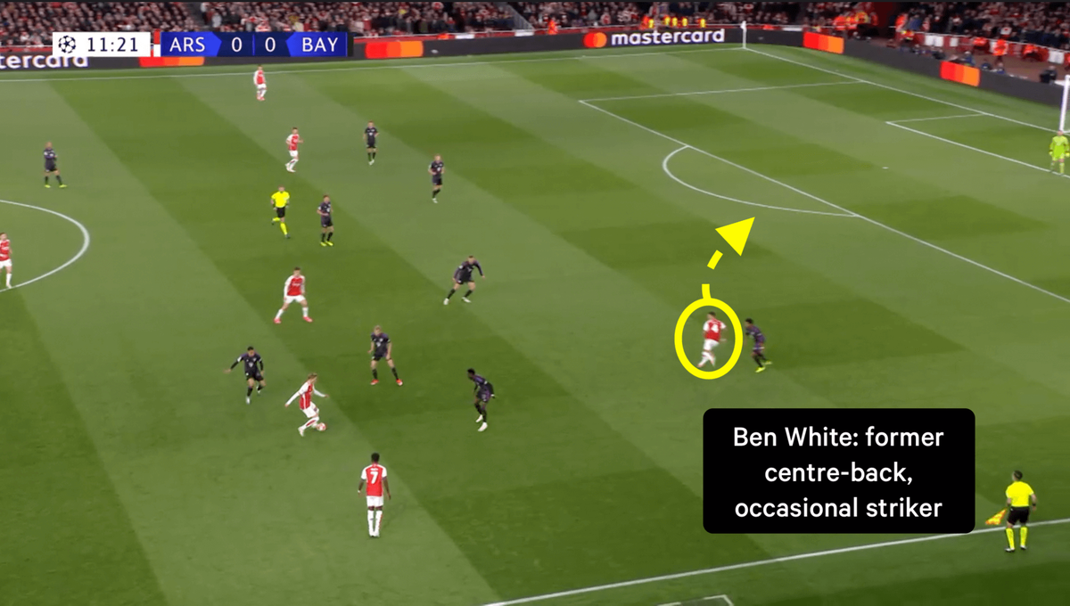 В начале владения, когда Уайт начал забег в атаку, «Арсенал» начинал в своей обычной экспансивной схеме 4-3-3 против классической оборонительной схемы «Баварии» Томаса Тухеля: ровная линия из пяти игроков сзади, охватывающая всю ширину поля, и узкий пятиугольник перед ними, отрицающий центр. Это оставило пространство на флангах, где обычно действуют крайние защитники «Арсенала».
