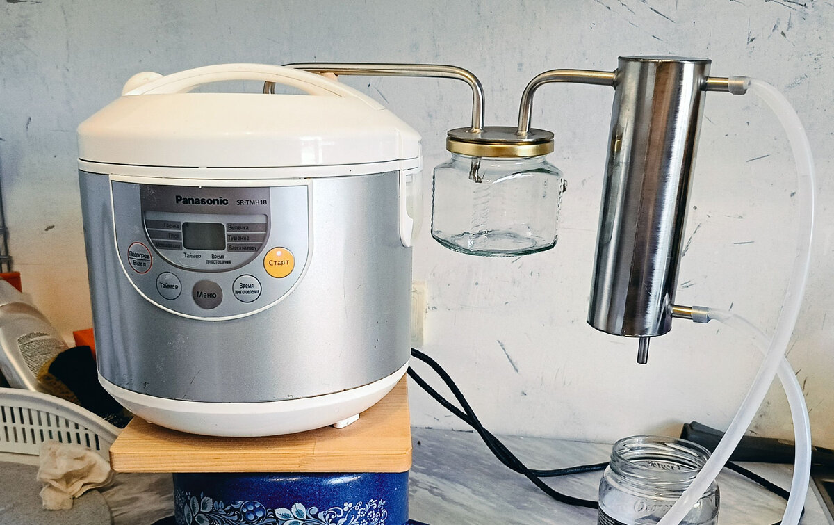 Думал я, что изобрёл сам, ан нет. :) Цель самоделки,- приготовление ароматных водок, ароматных вод, мацератов в небольших объёмах. Мне интересен не столько процесс употребления ( организм отторгает алкоголь в классических дозах), сколько процесс изготовления чего-то своими руками, увлечение, так сказать.... А для этого необходимо много пробовать, экспериментировать, но делать это в больших объёмах не имеет смысла- вдруг не понравится??? С другой стороны, приготовить, пусть даже 0,5 литра ( я уже не говорю о стакане), в классическом кубе на 20-30литров, на мой взгляд, -утопия! Собственно по этому и был сделан этот аппарат. Мультиварку откопал в сарае, холодильник купил на... реклама да? В общем, в интернет-магазине за 1200р. Прекрасно подключается вместо клапана мультиварки. Опробовал сразу на головах. Мощности, а у этой мультиварки 670вт. - за глаза! Даже буду пробовать на других режимах нагрева, хотя, говорят, что задача максимально быстро перегнать, чтоб минимально варить мммм... н