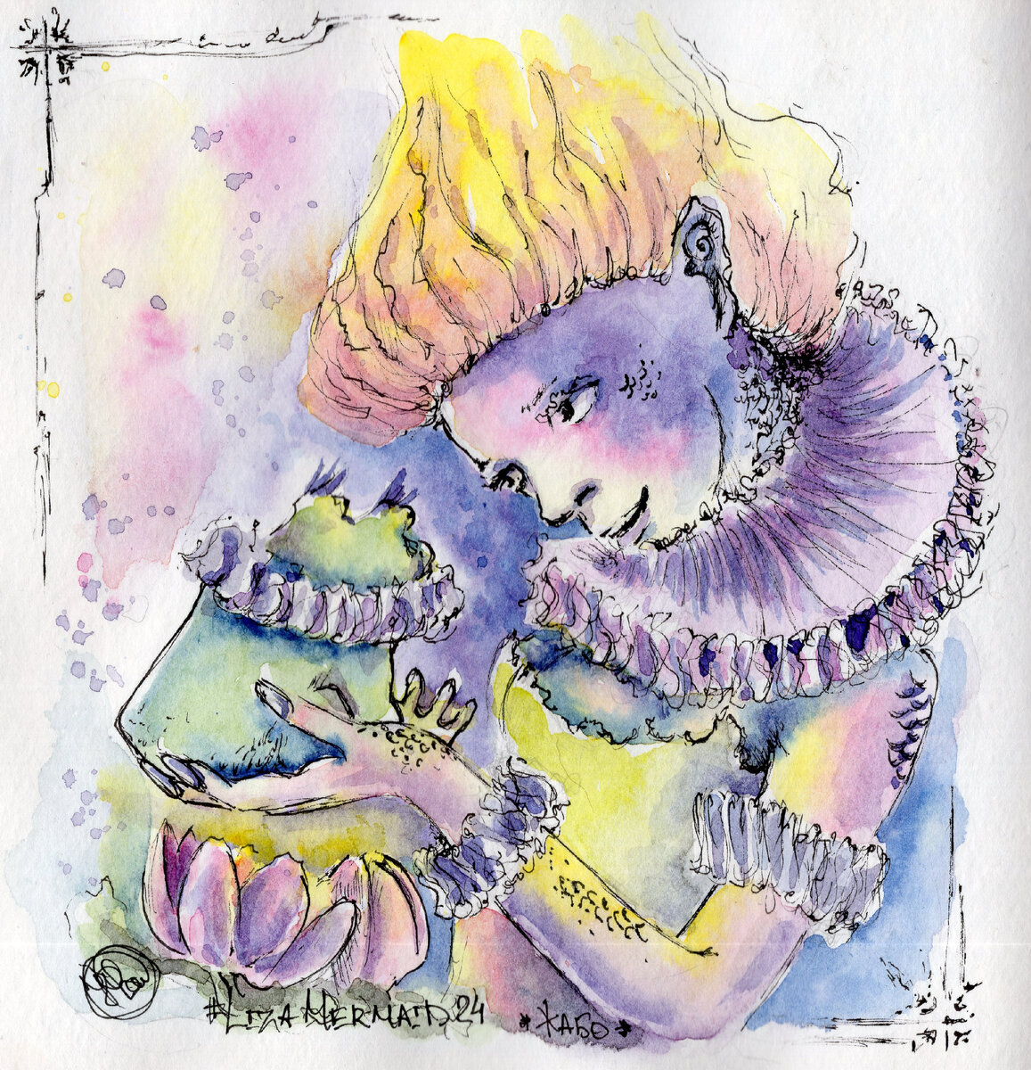В первом арте захотелось обыграть очень знакомую (сама ее допускала и порой допускаю) ошибку, когда слыша слово "жабо" думаешь о эдаком стоячем, круглом как тарелка воротнике. Представьте себе, что в подводном мире тоже есть модницы, которые тщательно следят за последними тенденциями писков моды. И, конечно, украшают не только самих себя, но и своих любимцев. И вот глядя на любимчика - жабку - русалка думает: