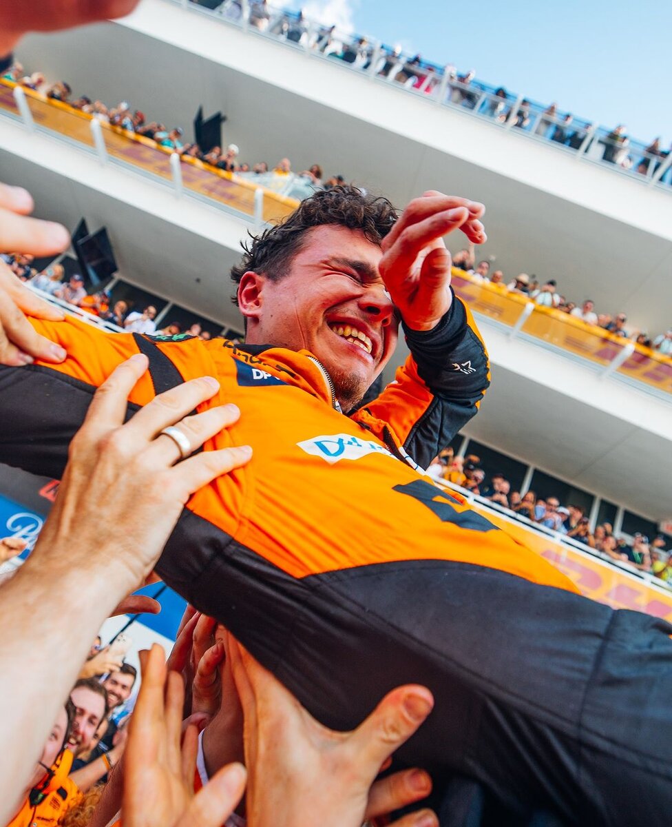 57 круг гонки-и Ландо Норрис одерживает свою первую победу в карьере,уехав от Макса на 7,5 секунд.Такой вроде бы молодой,но такой опытный Ландо радуется как ребенок,а с ним радуется и весь паддок.Макс,Льюис,Карлом,Шарль-все. У Ландо огромный талант,огромный потенциал как индивидуально,так и команды.