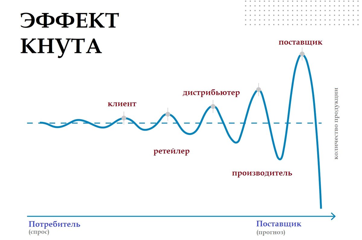 Эффе́кт кнута́ (англ. bullwhip effect) — феномен цепочки поставок, при котором заказы поставщикам, как правило, имеют бо́льшую изменчивость, чем продажи покупателям, что приводит к усилению изменчивости спроса по мере удаления от конечного потребителя. Это приводит к увеличению колебаний запасов в ответ на изменения потребительского спроса по мере продвижения вверх по цепочке поставок. Вот что говорит об этом Википедия.👆 Простыми словами, если мы представим всех участников цепочки поставок, которая как правило начинается от поставщика и заканчивается конечным клиентом, любые незначительные колебания спроса конечного клиента будут увеличиваться у каждого предыдущего участника цепи. Например, представим производство холодильников. В ретейле увеличился спрос на холодильники Х, ретейлер счёл это увеличение спроса тенденцией и заказал у дистрибьютора дополнительно +10% холодильников Х. Дистрибьютор отреагировал увеличением заказа данного товара у производителя и ещё плюсанул допустим 10%