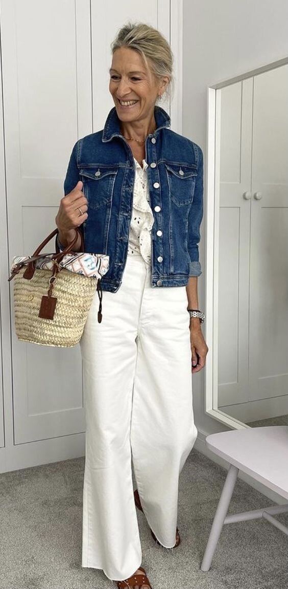 Обычно при упоминании «пенсионерки» в голове возникает образ бабули, которая одета в длинную юбку и устаревшего вида кофту. Но современная реальность подталкивает нас к мысли, что таких пенсионерок уже нет. Сегодня женщины выглядят очень стильно и современно в любом возрасте. Ниже несколько примеров для вашего вдохновения, доказывающих, что всем дамам можно выглядеть модно и стильно без возрастных ограничений. Вы точно не останетесь без внимания, если на вас будут белые джинсы. Они всегда выглядят эффектно и привлекают внимание. А в сочетании с белой блузкой получается монохромный образ. Разбавить его можно джинсовой курткой и соломенной сумкой. Сочетание бежевых брюк и черной футболки создают простой, но стильный образ. К ним остается добавить немного аксессуаров и туфли на небольшом каблучке. Следующий нежный образ создан в бело-розовых оттенках. Пудрового цвета штаны идеально гармонируют с белым верхом. Белая майка и твидовый жакет в белом цвете прекрасно освежают и создают омолажив