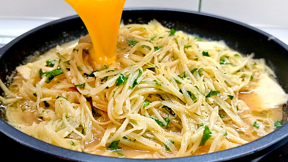 Почищенный картофель порезать тонкой соломкой специальной картофелечисткой или на терке для корейской моркови. Залить его холодной водой и дать постоять несколько минут Накрошить пучок петрушки или укропа. Высыпать в миску и добавить к зелени сырые яйца