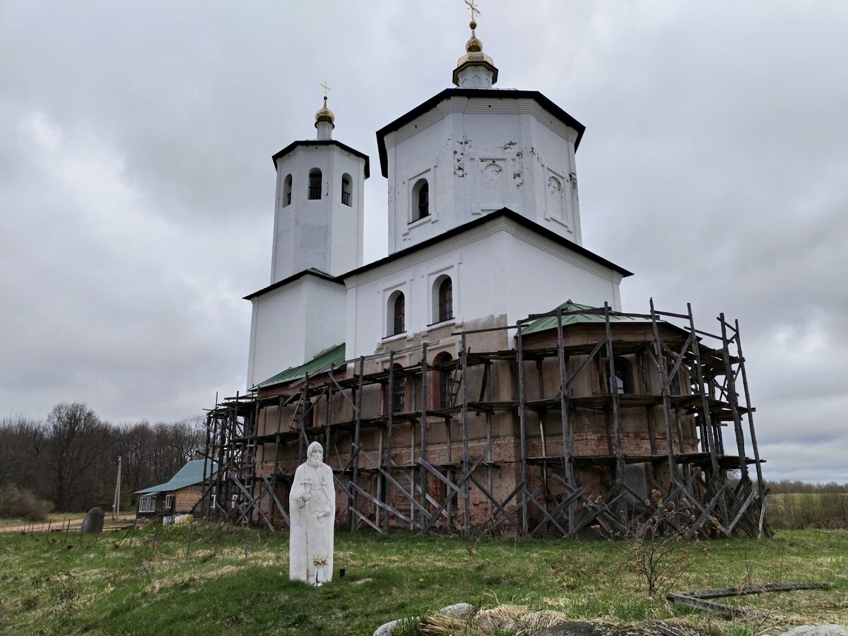 Это церковь Святителя и Чудотворца Николая, находится в Локнянском районе, между двумя деревнями Голенищево и Алексеевское. Церковь была построена в далёком 1767 году. Раньше вокруг церкви было кладбище, которое было уничтожено в 50-х годах прошлого века. Сама церковь была закрыта в 1936-м году. В постсоветское время была заново открыта и освещена, и тут даже проводятся службы. Сейчас она находится на реставрации. Видно, что верхняя часть уже восстановлена. К сожалению, мы не смогли попасть внутрь, так как всё было закрыто. Мы просто походили вокруг.