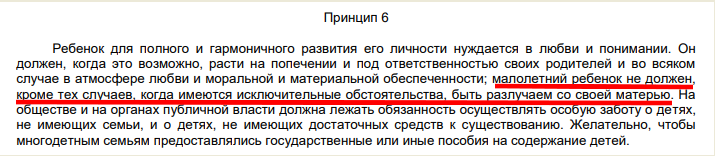 Ранее суды ориентировались на принцип 6 Декларации прав ребенка, принятой резолюцией Генеральной Ассамблеи ООН от 20 ноября 1959 года. В котором и были указаны те самые «исключительные обстоятельства», при отсутствии коих малолетний (то есть до 14 лет) ребёнок не должен разлучаться с матерью: