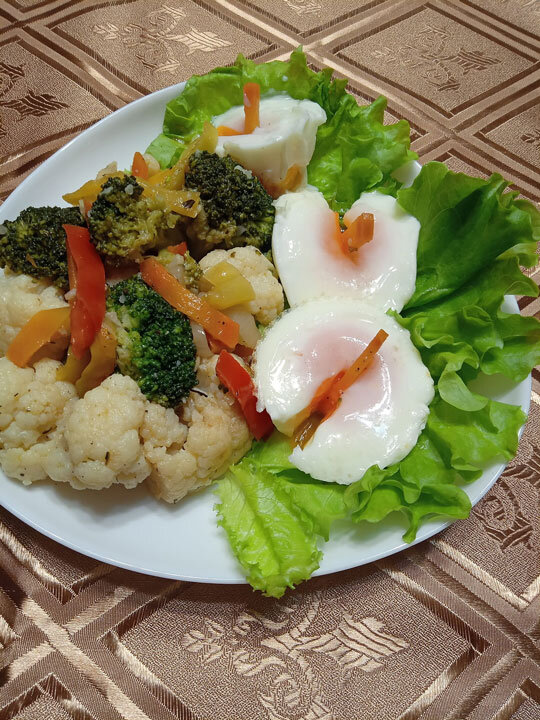 Сегодня - не о яйцах, а о вкусном хрустящем салате. Отвариваем 3 минуты цветную капусту и капусту брокколи, и сразу же опускаем в холодную воду, чтобы сохранить цвет. Среднюю луковицу режем полукольцами, болгарский перец - полосочками и маленькую морковку брусочками. Быстро слегка обжариваем в воке на 1 ст. л. растительного масла. Для заправки смешиваем 1 ст. л. яблочного уксуса и 1 ст. л. оливкового масла с 1 ч. л. бальзамического уксуса и специями (кориандр, базилик, сухой чеснок, душистый перец). Капусту смешиваем с овощами и соусом, и ставим в холодильник на 1-2 часа. И можно употреблять как гарнир со всеми белковым блюдами. КБЖУ на 100 г – 87/1,5/5,5/6,4. От наших друзей: Владимир Лёвкин на Радио Медиаметрикс Больше общения и рецептов - в группе "Рецепты для диабетиков" в ВКонтакте! Рецепт на странице Автор рецепта – Софья Григорова © Почтенный возраст Online и Рецепты для диабетиков
