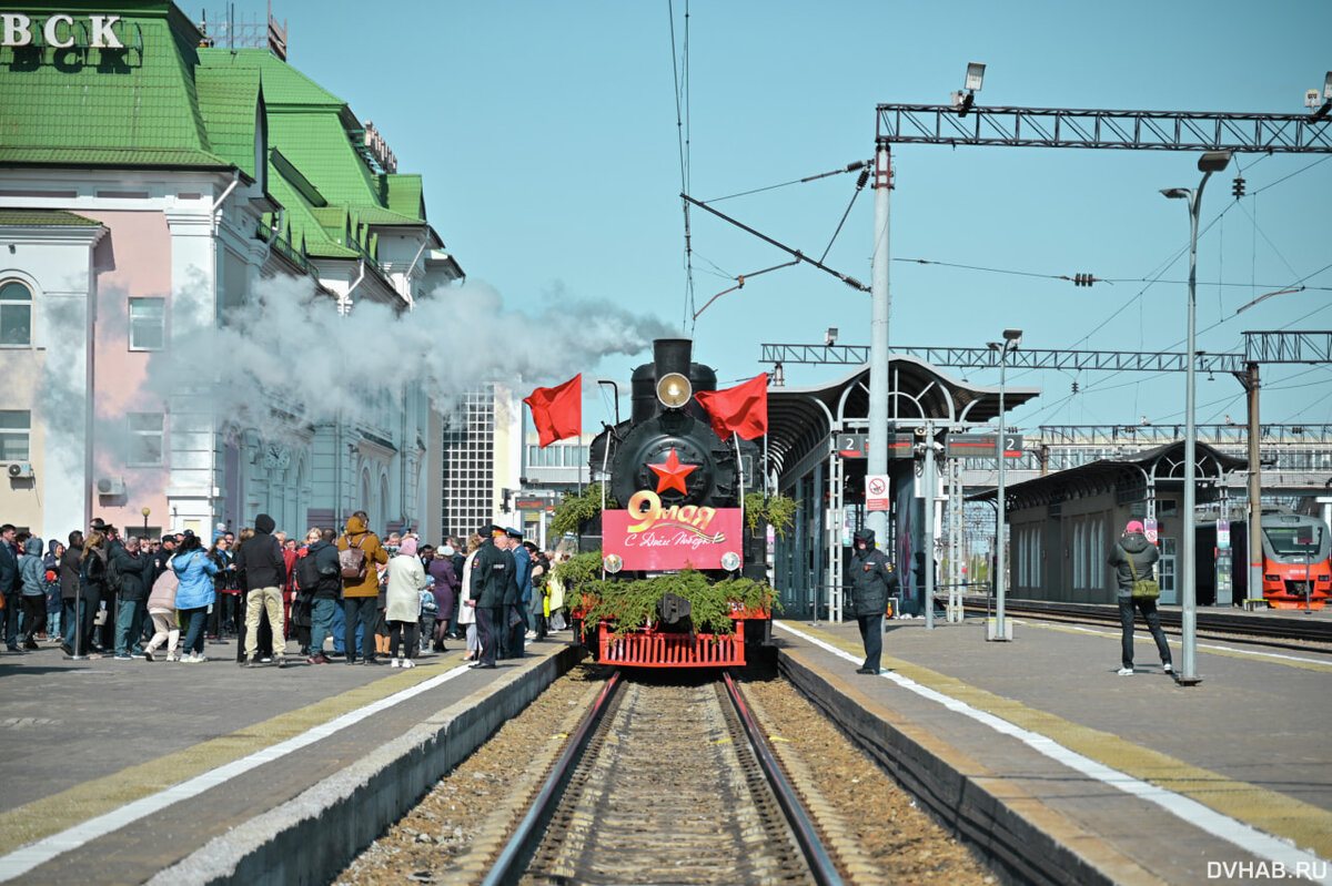 Сегодня в Хабаровск прибыл «Поезд Победы». Мероприятие приурочено к грядущему празднованию 9 Мая. Ретро-состав встретили десятки жителей краевого центра, а также первые лица города. Все желающие могли сделать фотографии с пушками и танком. Каждый поезд включает в себя пассажирские вагоны для ветеранов, платформы с историческими реконструкциями и экспозициями военной техники времен Великой Отечественной войны. Пришедших ожидал торжественный митинг, который прошел на площади Дворца культуры железнодорожников. Был организован концерт с песнями военных лет, танцами и музыкой. В частности, во время представления вокруг пушки сидели солдаты и писали письма домой. Далее поезд отправился на станцию Вяземская. Впервые в этом году, помимо традиционного маршрута во Владивосток, в Уссурийск и Хабаровск, праздничный состав прибудет в Тынду. Напомним, что в конце марта поезд «Сила в правде» работал в Хабаровске. Агитационный состав Минобороны РФ работал на железнодорожном вокзале в рамках всероссийс