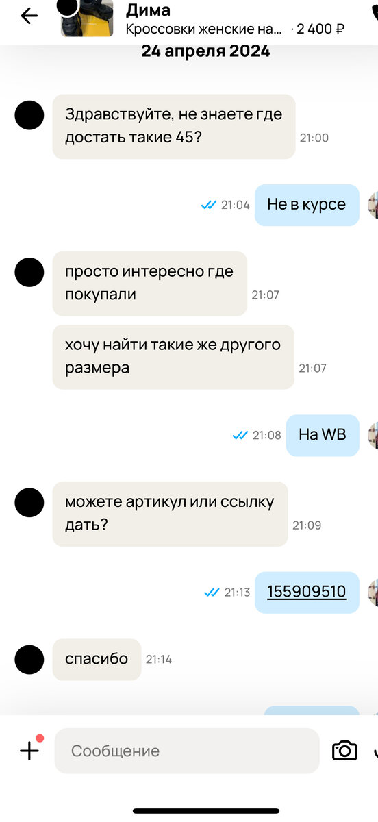 Решила я продать через Авито кроссовки, которые покупала на WB в прошлом году. Там их выдавали за оригинал, а я повелась. В итоге обувь мне оказалась неудобна, надевала кроссы буквально несколько раз. Подробнее о подделке на Wildberries можно почитать в моей статье, ссылка ниже: Кроссы, а точнее объявление с ними хорошо смотрят, даже спрашивали другой размер, хотя у меня указано «б/у». Да и по фоткам видно, обувь не новая. Любят же наши люди всякие копии да подделки… Потом писала очередная умница с вопросом про размер стельки, хотя указано в объявлении, что идут в размер. После замера, естественно, полнейшая тишина. Без любителей торговаться тоже не обошлось. Я бы и отдала их за 2000 (продаю за 2400), но при самовывозе. И вот последняя наглая особа меня просто добила! Требовала на примерку отправить в другой город, а за отказ- сначала долго возмущалась, а после накатала на меня жалобу. Ниже скрины переписки: Кстати, Авито ревностно отнеслось к отправке клиента на маркетплейс. Види